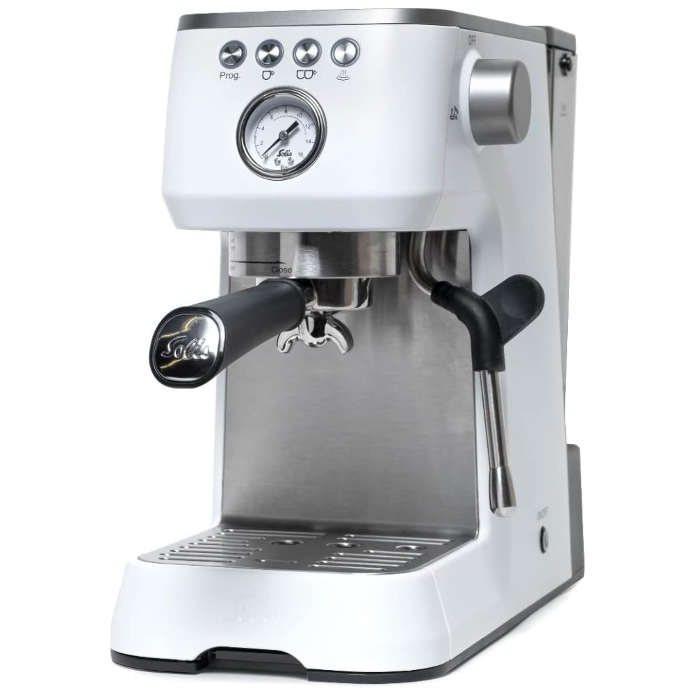 Procurando um grande começo no mundo do café expresso O Solis Perfetta oferece uma excelente plataforma para você começar e muito mais. Projetado com s usuários em mente, mas capaz de acompanhar as necessidades dos entusiastas, o Perfetta é o ajuste perfeito para s baristas domésticos e aqueles que procuram um pouco mais. O que realmente diferencia o Perfetta é a variedade de recursos de ponta que você obtém nesta máquina acessível. O tempo de disparo programável permite que você disque sua foto perfeita e a replique todas as vezes. Uma varinha de vapor de orifício único oferece um controle de leite excepcional e a capacidade de criar uma microespuma impressionante, especialmente considerando o custo desta máquina.