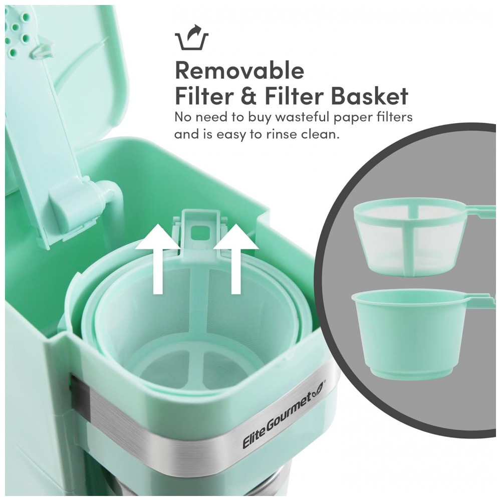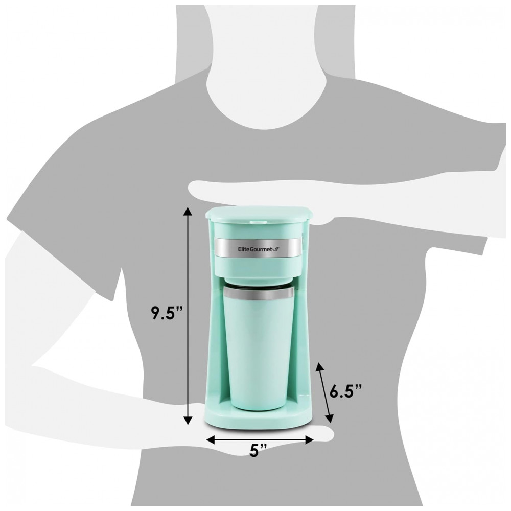 TUDO QUE VOCÊ PRECISA: O fabricante de café de serviço único pessoal Elite Gourmet tem tudo o que você precisa para desfrutar de café fresco e quente. Vem completo com base de cafeteira, caneca de viagem, tampa e filtro reutilizável.
