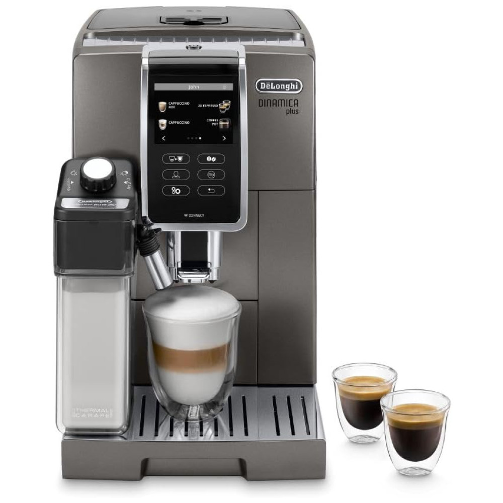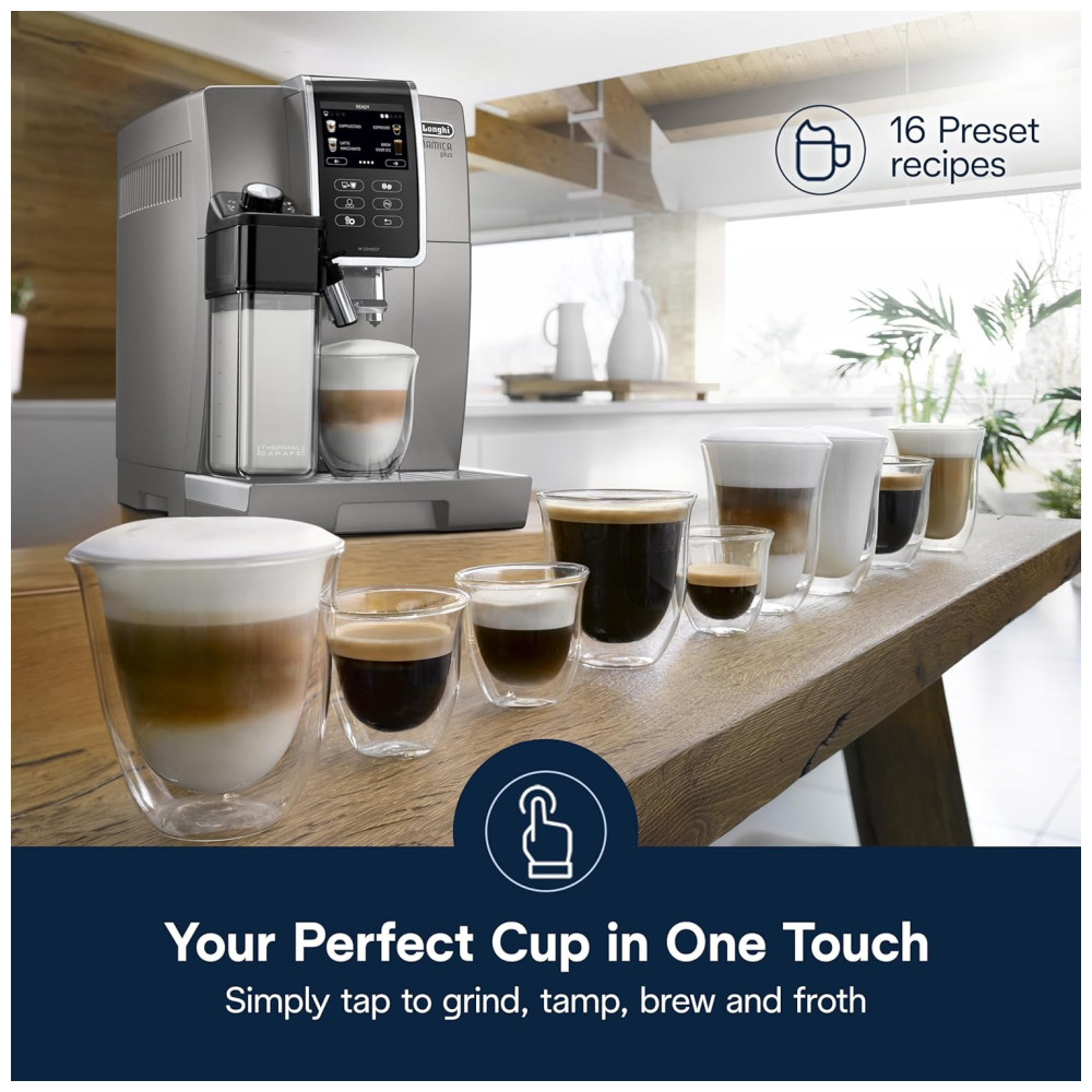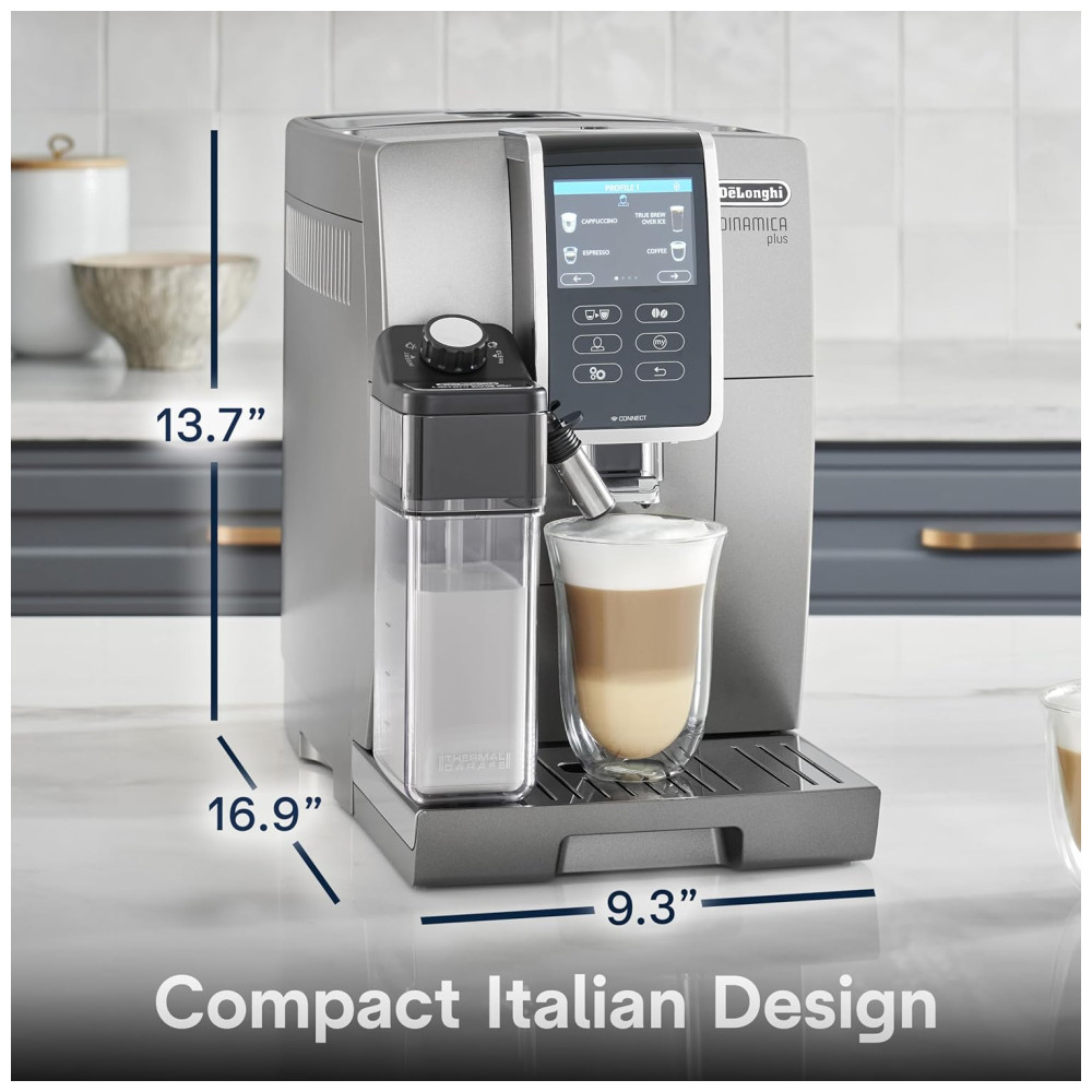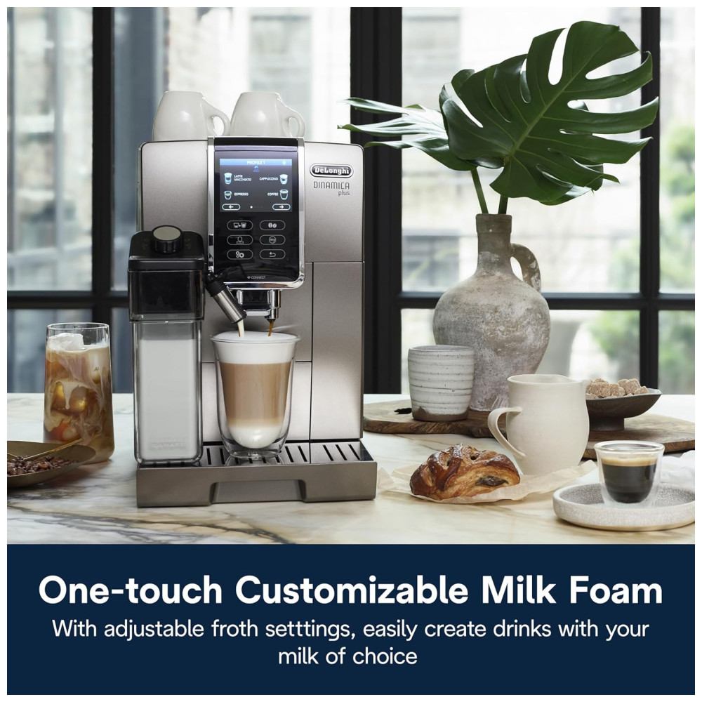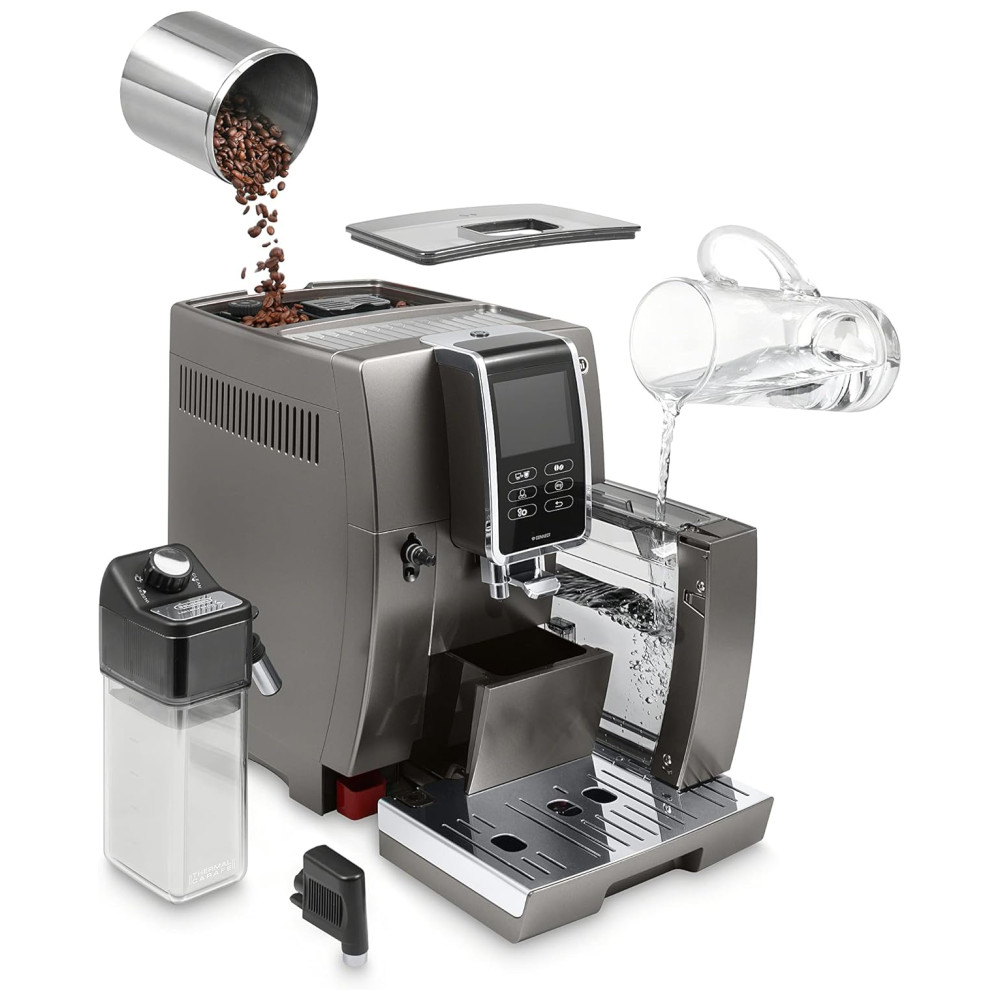 Componentes incluídos Máquina de café expresso totalmente automática De Longhi Dinamica Plus, filtro de carbono ativo, colher de medição, teste de dureza total, escova de limpeza, descalcificador 100mL, bico de água removível, jarro de leite