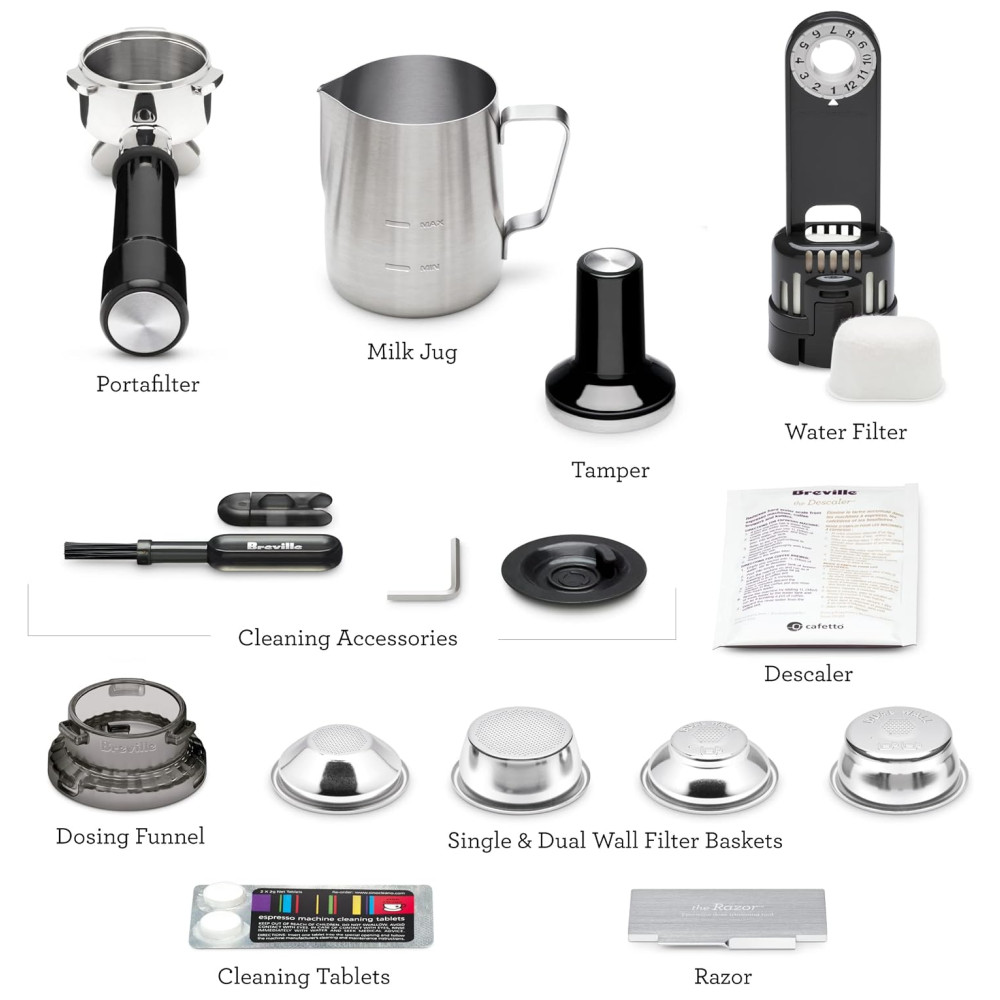 Acessórios incluídos Parede simples e dupla 1 e 2 xícaras Cestas de filtro, A Ferramenta de Corte de Dose de Precisão da Navalha, Jarra de Leite de Aço Inoxidável de 480 ml, Kit de Limpeza e Filtro de Água
