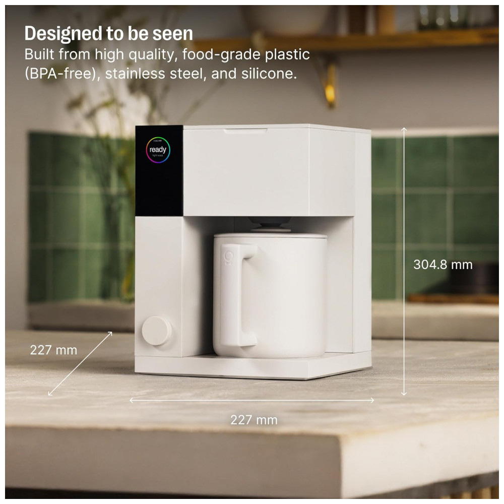 O recipiente térmico mantém o café quente por até duas horas, garantindo conservação térmica eficiente. A máquina possui função de agendamento via aplicativo mobile, com sincronização de perfis de preparo e notificações, integrando controle manual e automático para personalização ampla. A tampa de silicone vedante protege armários contra vapor, e o enrolador de cabo mantém organização. Construída com plástico BPA-free, aço inoxidável e silicone de grau alimentício, pesa 3,16 kg e tem capacidade de reservatório de 1,5 litros.