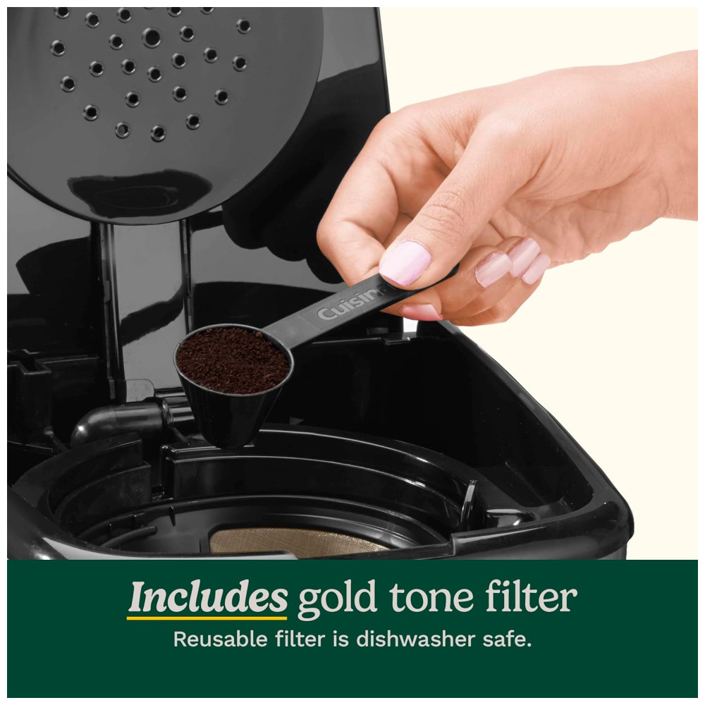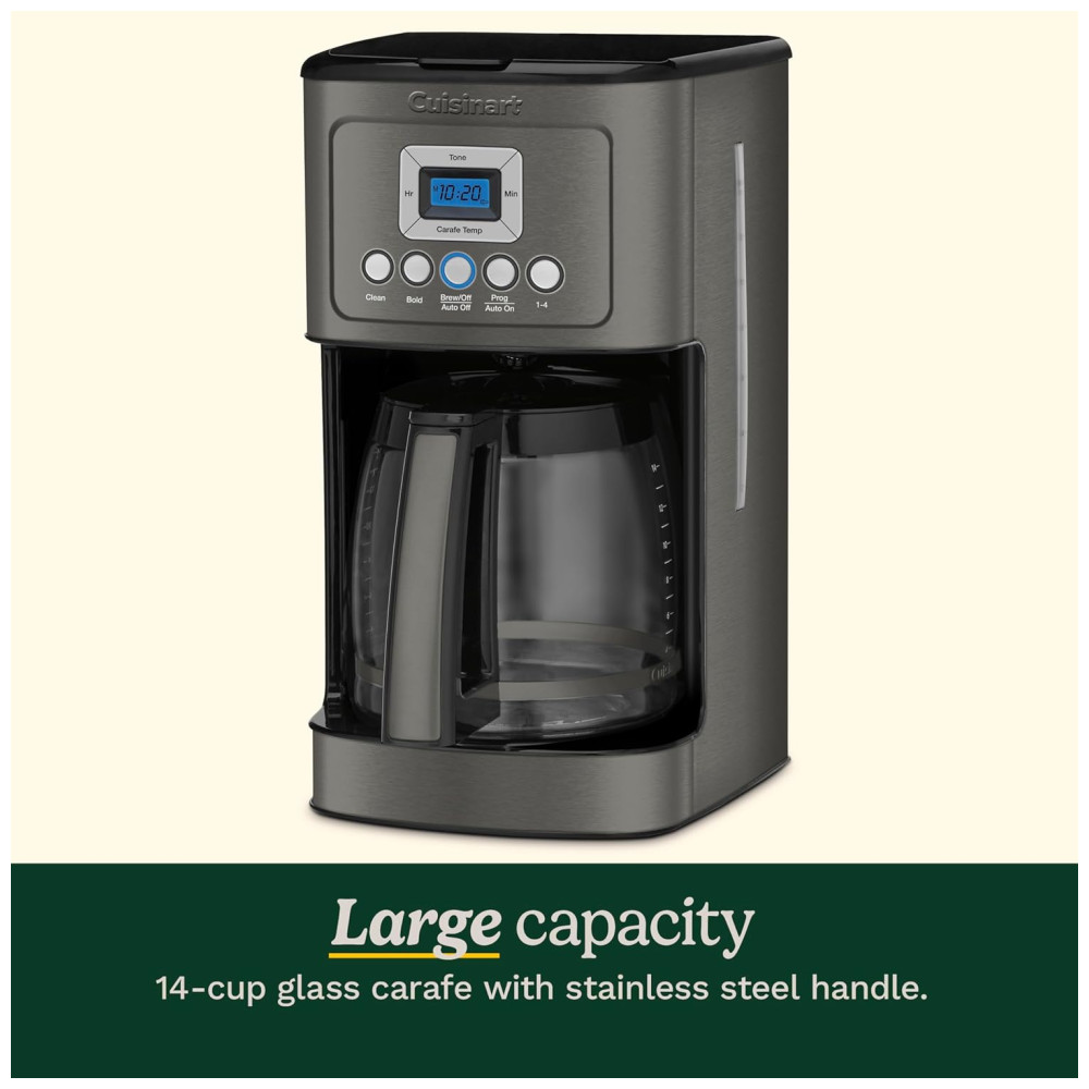 Tamanho 14 Xíc. Cor Aço Inoxidável e Preto Embalagem do produto Embalagem padrão Aumente o sabor e a temperatura do seu café com a cafeteira Cuisinart com 14 xícaras programáveis Usando nossa tecnologia de ponta, a cafeteira programável de 14 xícaras pode oferecer café mais quente sem sacrificar o sabor. Escolha um perfil de sabor regular ou o e defina o tempo de preparo para até 24 horas à frente, para que sua próxima xícara esteja pronta quando você estiver. O LCD retroiluminado é fácil de ler, um tom pronto pode ser ligado ou desligado e uma luz indicadora sinaliza quando é hora de descalcificar. Características Café mais quente, com tecnologia de fabricação de café especializada para garantir uma temperatura mais quente do café, sem sacrificar o sabor ou a qualidade O controle da força de infusão permite selecionar o sabor Regular ou Negrito do café Totalmente automático com programação de 24 horas, auto limpeza, limpeza automática de 1 4 x 04 horas e tom de alerta pronto opcional Jarra de vidro de 14 xícaras com alça decorativa de aço inoxidável Janela de água de fácil visualização para um preenchimento preciso O recurso Brew Pause permite que você desfrute de uma xícara de café antes do término do ciclo de fabricação 60 Segundo Reset recupera configurações e posição no processo de fermentação em caso de perda de energia Filtro de café de tom dourado e filtro de água de carvão vegetal