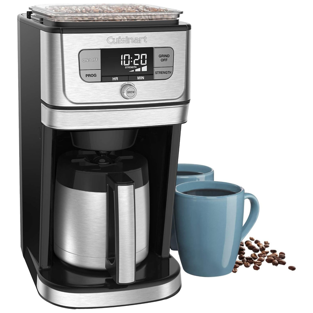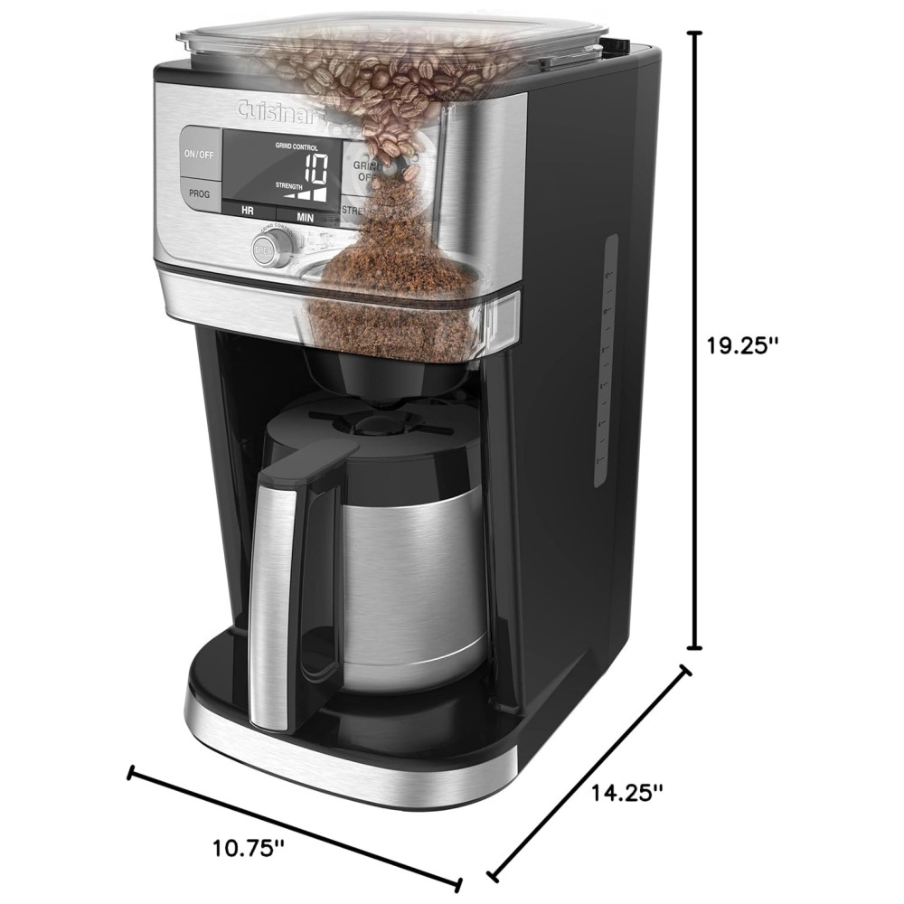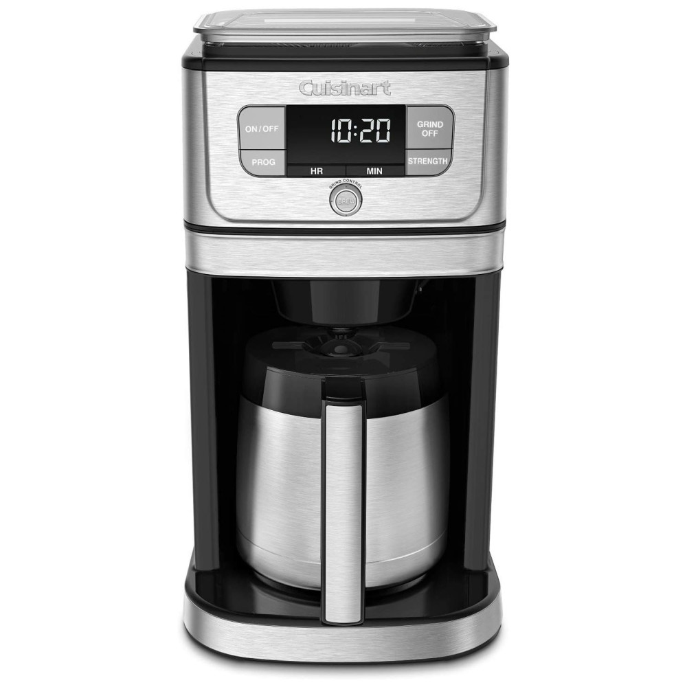 Cor prata Tamanho 10 xic Estilo Jarra térmica Deixe para Cuisinart fazer um café delicioso, moído na hora e recém moído, uma experiência ainda melhor. A cafeteira para 10 xícaras Grind Brew apresenta um inovador conjunto de moagem DirectFlow que move o café sem problemas pelo moedor de rebarbas de estilo profissional até a cesta de café. Um recurso AutoRinse garante que todos os grãos de café entrem no cesto de infusão para facilitar a limpeza excepcionalmente Moe apenas a quantidade de feijão necessária, de acordo com o número de xícaras selecionadas. Os controles intuitivos oferecem três pontos fortes de sabor e uma tela grande fornece uma visão clara das seleções personalizadas. É uma tecnologia inovadora para fazer café e Cuisinart no seu melhor Características Jarra térmica de 10 xícaras com alça de conforto Moedor de rebarbas de estilo profissional para obter consistência uniforme O conjunto de moagem do DirectFlow distribui perfeitamente os grãos diretamente no cesto de infusão O AutoRinse garante que todos os grãos de café entrem no cesto de infusão Tremonha de meio quilo com tampa selada mantém os grãos frescos Opções de resistência ao sabor negrito ou extra negrito regulares Controle de moagem programa para 4 a 10 xícaras O recurso de moagem permite que você use café pré moído Visor LCD extra grande e operação intuitiva Início da fermentação em 24 horas Filtro permanente em estilo com tom dourado Filtro de água a carvão remove impurezas O recurso Brew Pause permite que você desfrute de um copo antes de terminar a fermentação