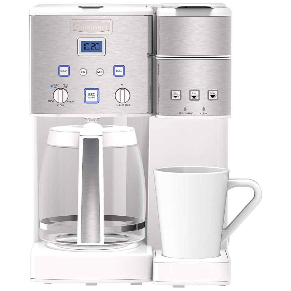 Tamanho 12 copos , jarra de vidro Cor branco. O centro Cuisinart Coffee possui uma cafeteira totalmente automática para 12 xícaras de um lado e uma cafeteira de serviço único, por outro. Beber sozinho ou servir uma multidão, é fácil apreciar o sabor gourmet que você espera de uma cafeteira Cuisinart. E uma cafeteira que faz o trabalho de duas libera mais espaço no seu balcão