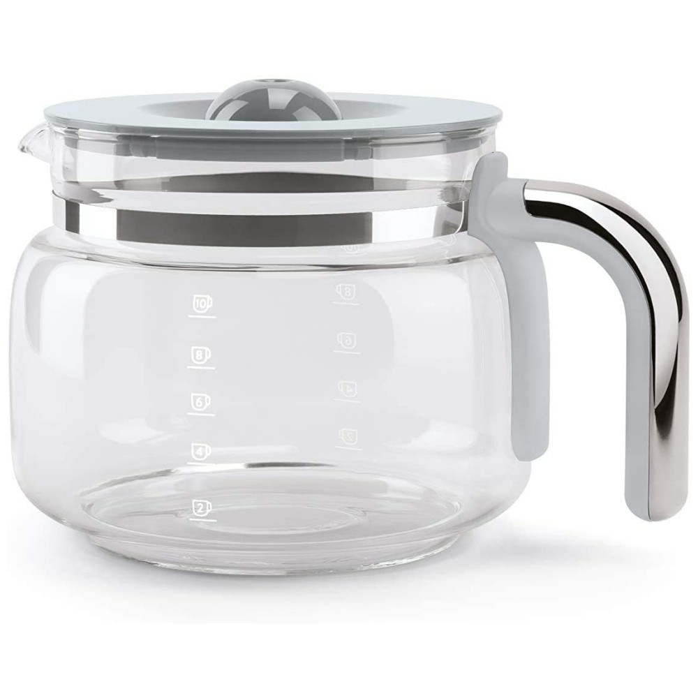 Esta máquina de café com filtro de gotejamento estilo retro Smeg 50 tem uma jarra de vidro com capacidade para 10 xícaras, função de 4 xícaras, modo de início automático e início automático em um determinado momento.