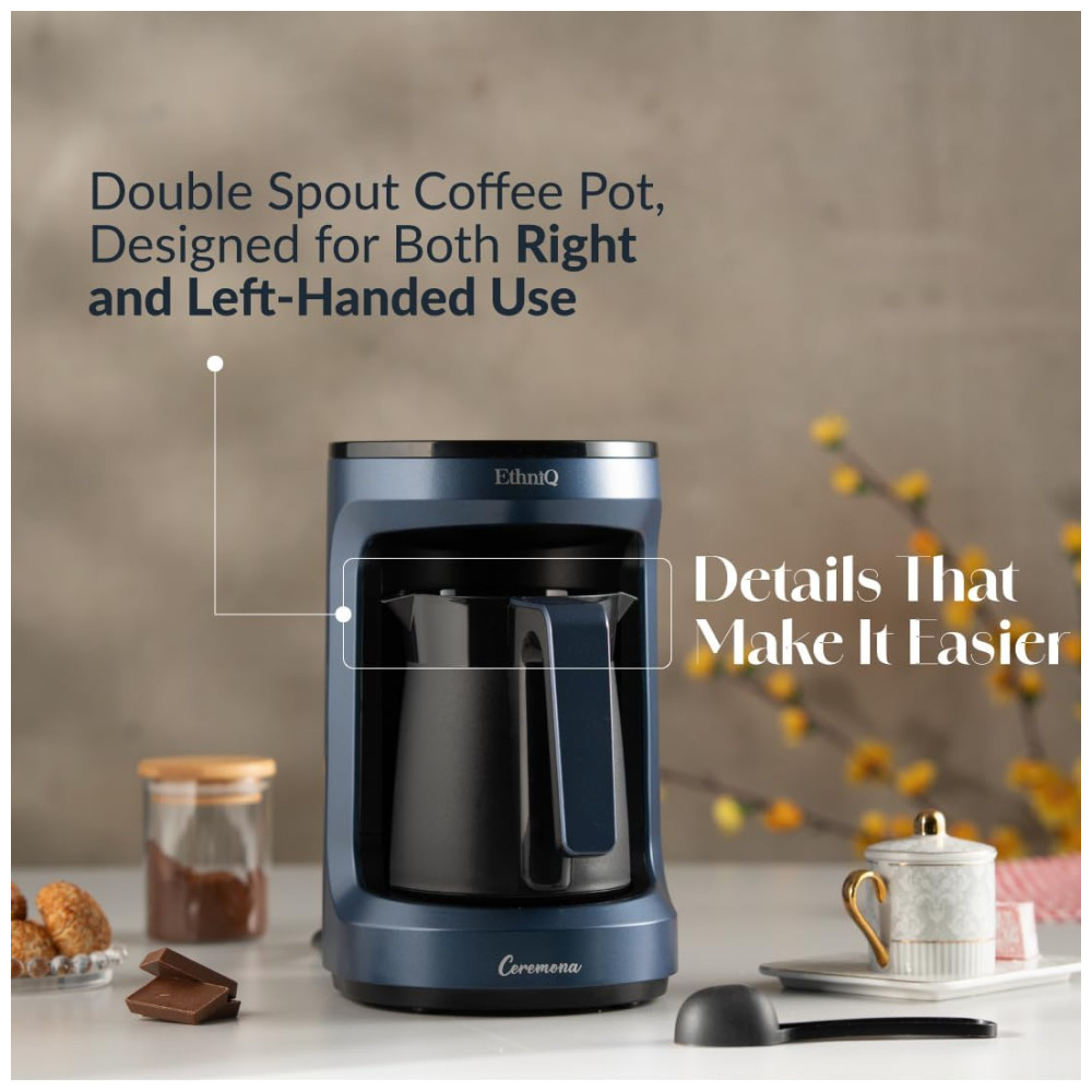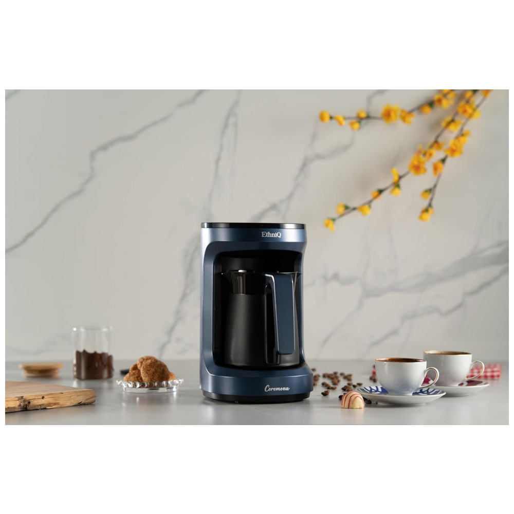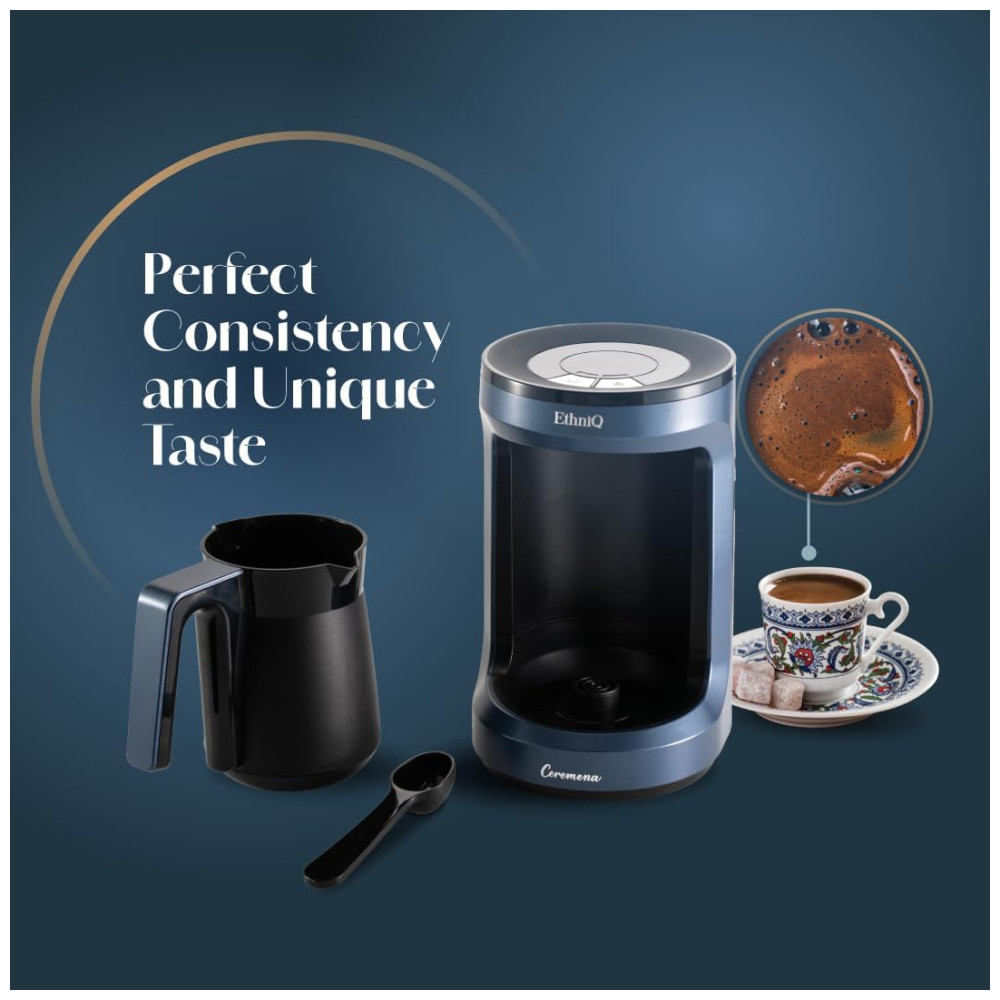 FAÇA CAFÉ TURCO AUTÊNTICO A cafeteira perfeita para quem gosta de uma xícara forte e ousada de café turco. A cafeteira elétrica turca vem com todas as ferramentas que você precisa, incluindo uma colher medidora e um copo de água Com minutos de tempo de preparo para que nunca haja espera pelo primeiro gole.