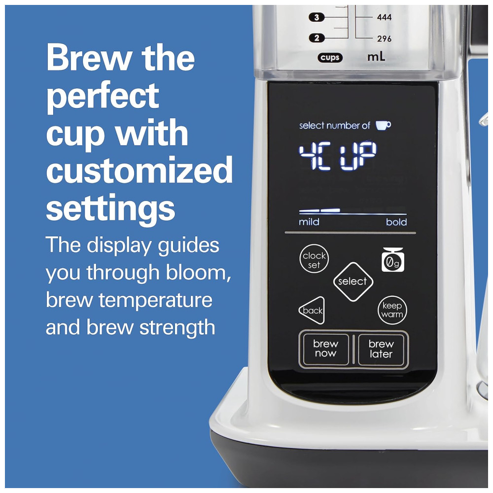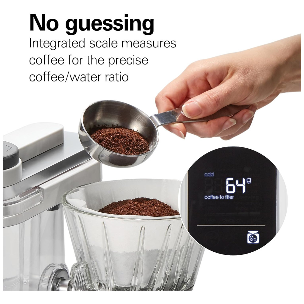 NÃO HÁ SUGESTÕES A escala integrada faz a contagem regressiva à medida que você adiciona grãos de café para preparação manual ou automatizada. Ele elimina suposições de derramamentos de café, garantindo que você adicione a quantidade exata de pó de café para a proporção exata de café , água todas as vezes.