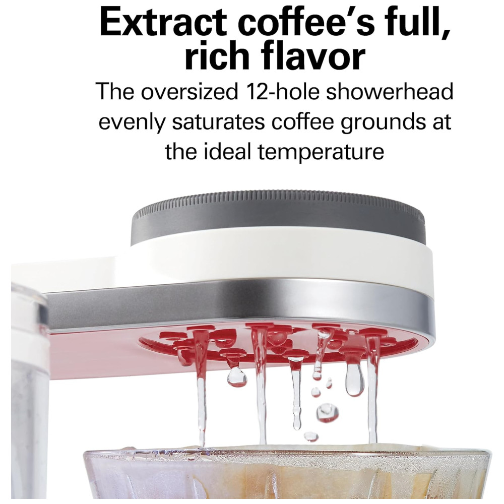 SABOR RICO E COMPLETO DO CAFÉ EXTRATO O chuveiro de 12 furos superdimensionado satura uniformemente os grãos de café na temperatura ideal, para extrair os sabores ricos e equilibrados do seu café. Use para infusão automática ou gire para fora do caminho para derramamentos manuais.