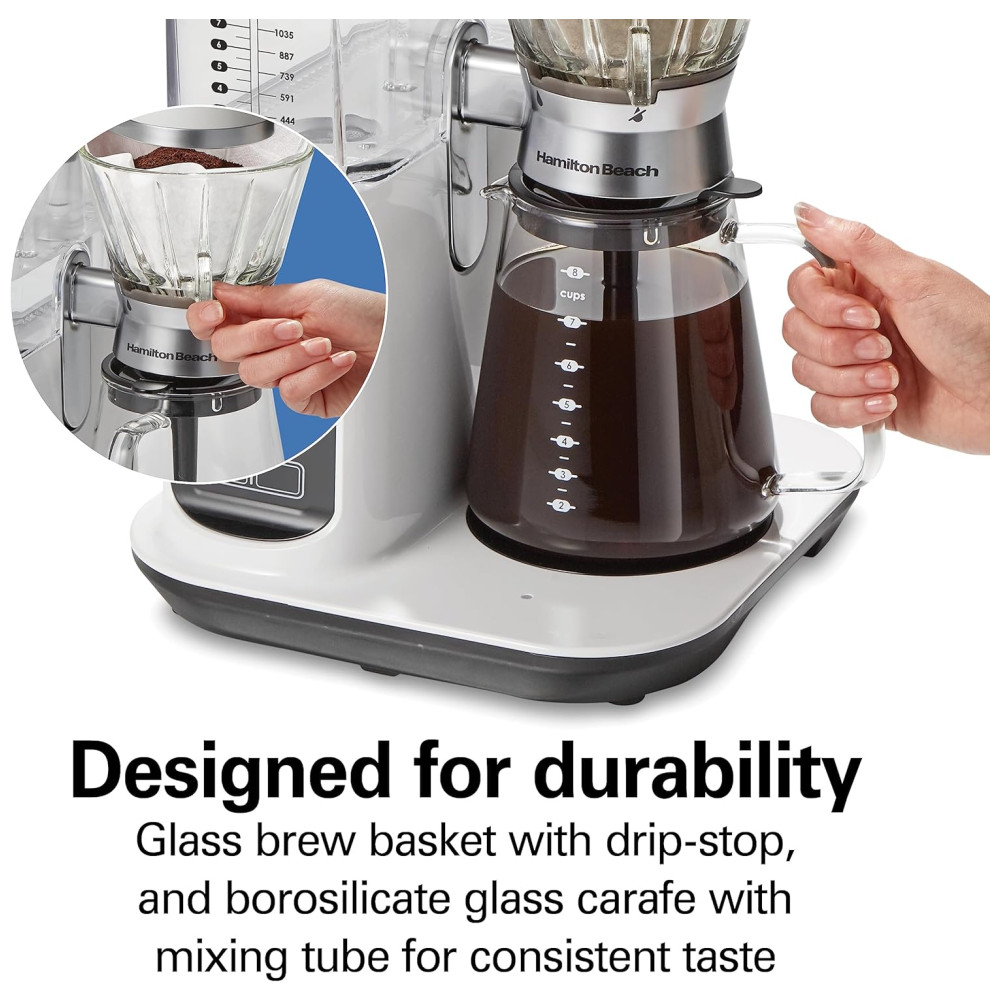PROJETADO PARA DURABILIDADE O anti gotejamento na cafeteira evita que pingue quando a jarra é puxada. A garrafa de vidro de borosilicato durável tem um tubo de mistura interno que mistura café para um sabor consistente do primeiro gole até a última gota