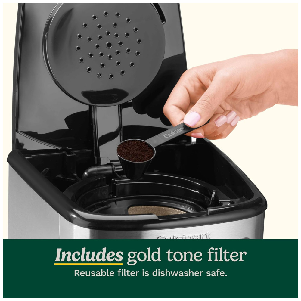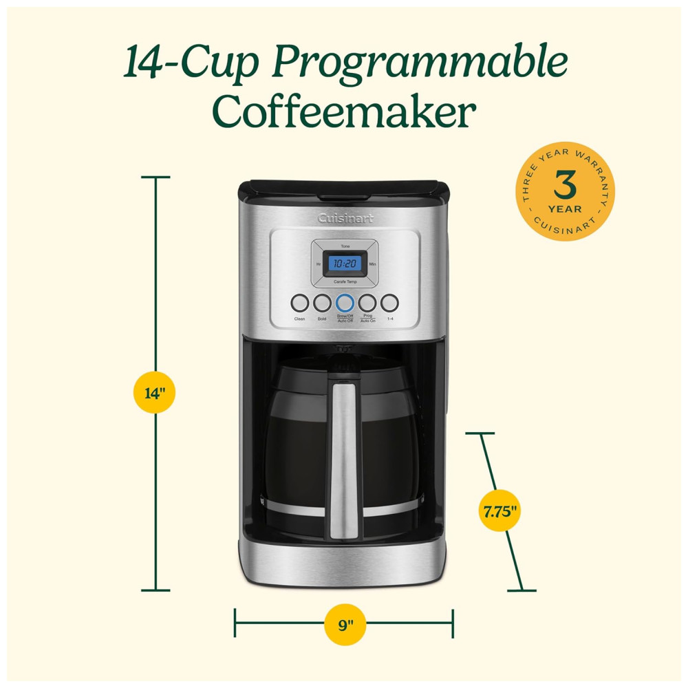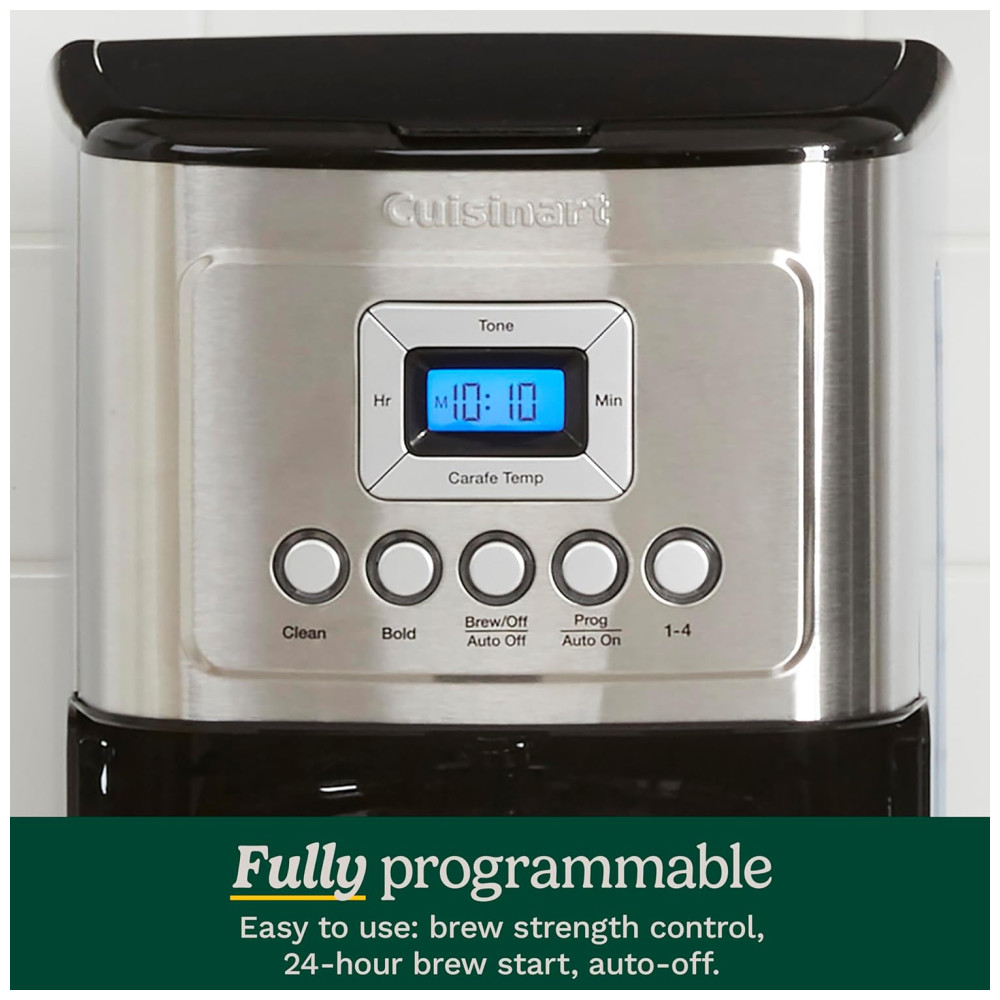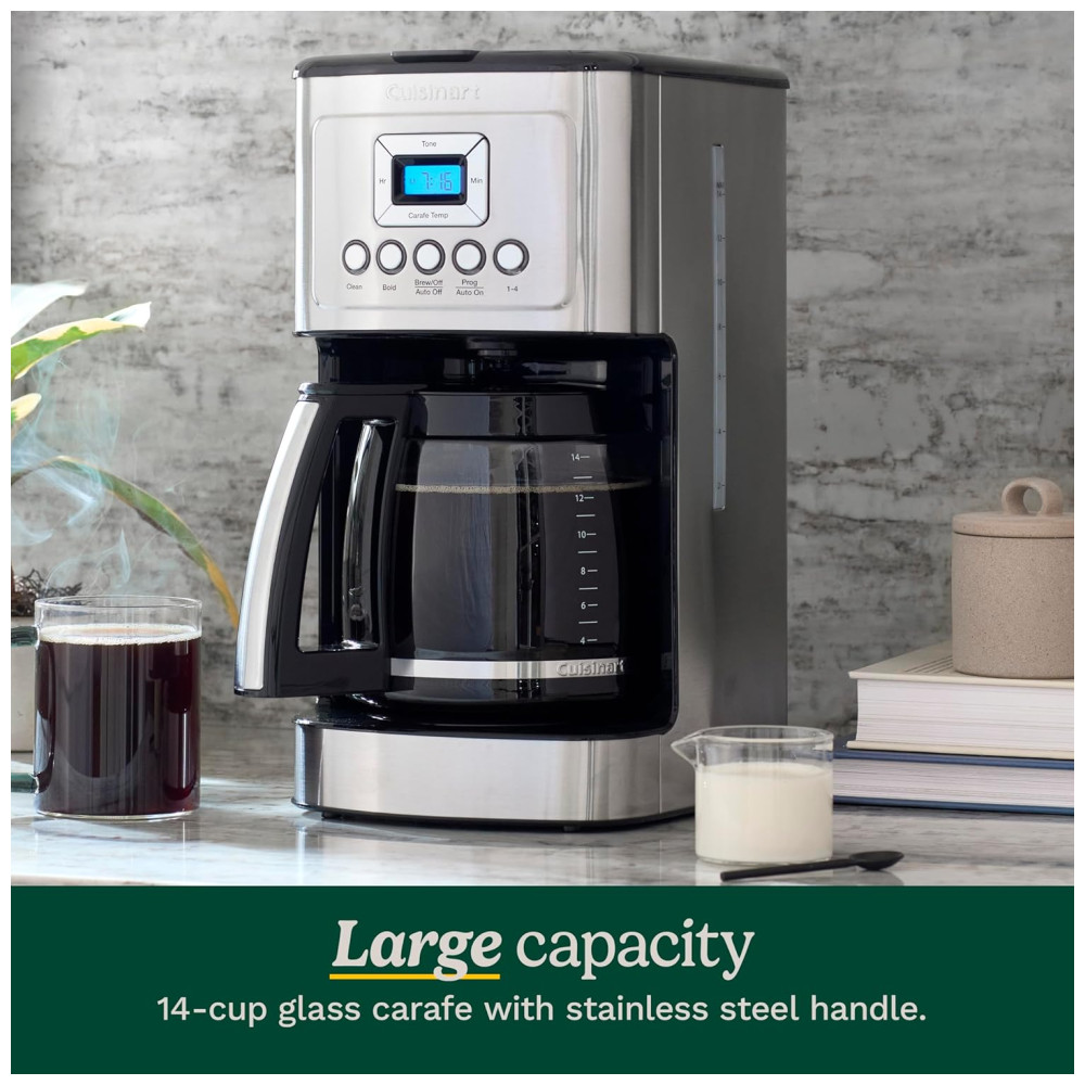 Tecnologia de ponta para garantir um café mais quente sem sacrificar o sabor ou a qualidade O controle da intensidade da infusão permite selecionar o sabor regular ou o do café Totalmente automático com programação de 24 horas, autolimpeza, configuração de 1 a 4 xícaras e automático desligamento 0 4 horas Ajustável para manter o controle de temperatura quente Tom dourado, filtro permanente de estilo . Aumente o sabor e a temperatura do seu café com a cafeteira Cuisinart Usando nossa tecnologia de ponta, a cafeteira programável para 14 copos pode oferecer café mais quente sem sacrificar o sabor. Escolha um perfil de sabor regular ou o e defina o tempo de preparo em até 24 horas à frente para que sua próxima xícara esteja pronta quando você estiver. O LCD com luz de fundo é de fácil leitura, um tom de pronto pode ser ligado ou desligado e uma luz indicadora sinaliza na hora de desligar. Consulte o manual do usuário para obter as etapas de solução de problemas. Características Café mais quente, com tecnologia de fabricação de café especializada, para garantir uma temperatura mais quente do café, sem sacrificar o sabor ou a qualidade O controle de intensidade de fermentação permite selecionar o sabor regular ou negrito do café 04 horas e tom de alerta pronto opcional Jarra de vidro de 14 xícaras com alça decorativa de aço inoxidável Janela de água de fácil visualização para um preenchimento preciso O recurso Brew Pause permite que você desfrute de uma xícara de café antes do término do ciclo de fabricação Segundo reset recupera configurações e posição no processo de fabricação de café em caso de perda de energia Filtro de café de tom dourado e filtro de água de carvão vegetal
