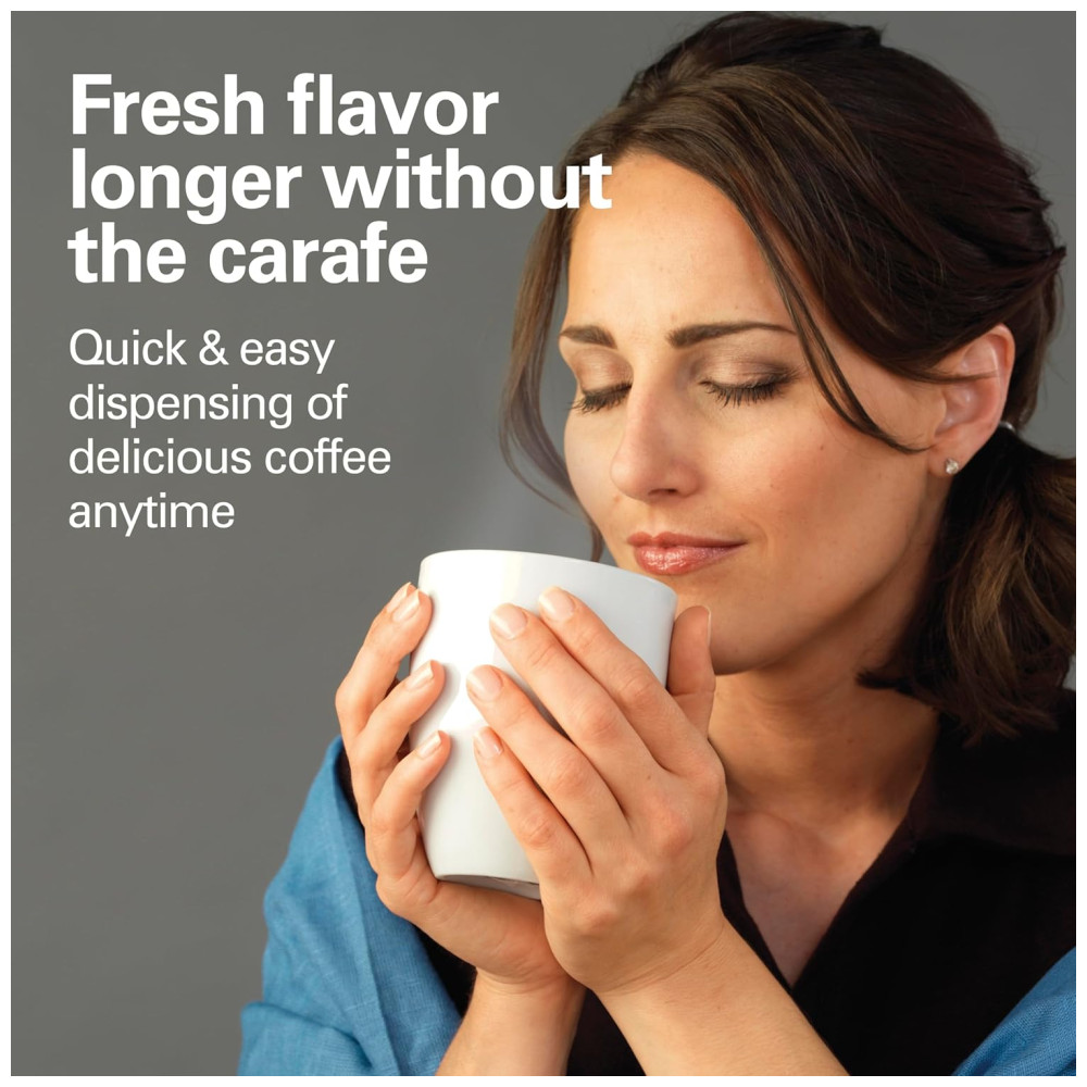 Funciona como uma cafeteira tradicional, mas mantém o café em um tanque interno. Nenhuma jarra necessária