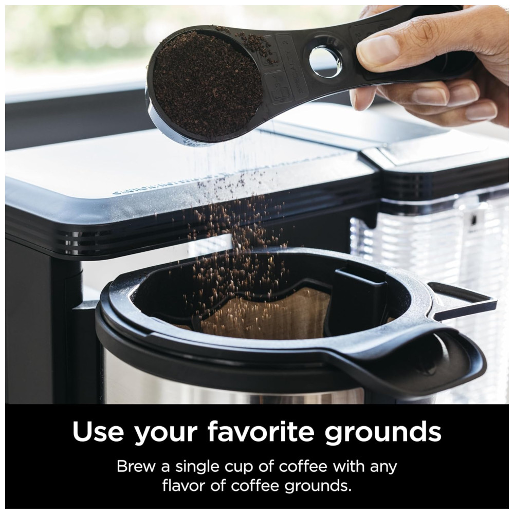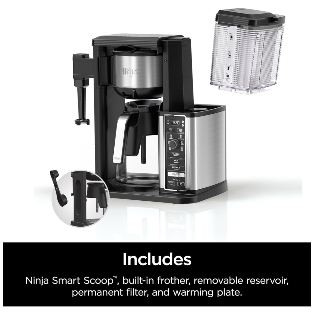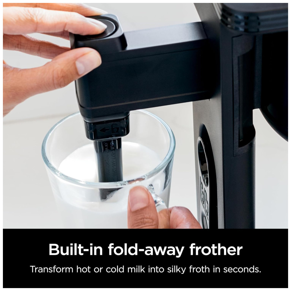 FÁCIL DE LIMPAR: A jarra de vidro, tampa de preparo, filtro permanente, suporte de filtro removível, reservatório de água, tampa flip-top, batedor de espuma e colher inteligente Ninja são todos laváveis na parte superior da máquina de lavar louça.