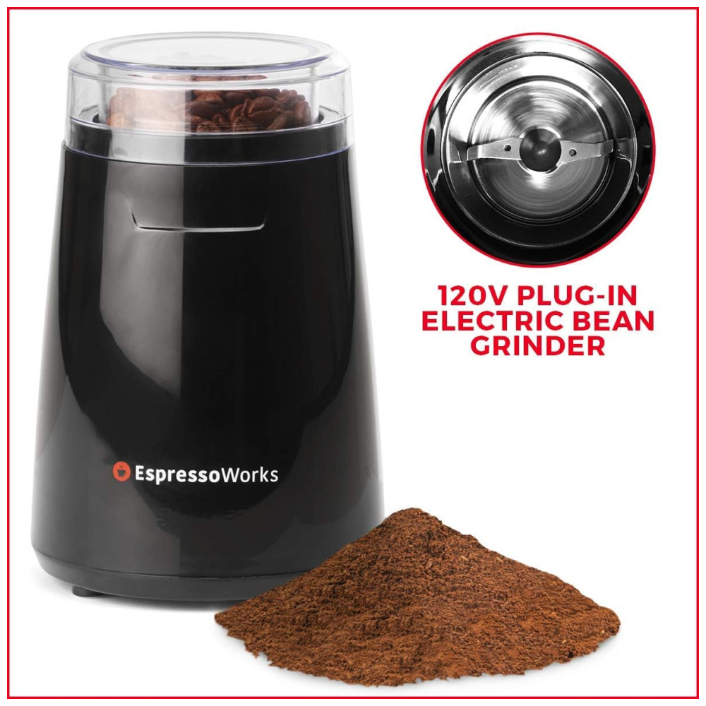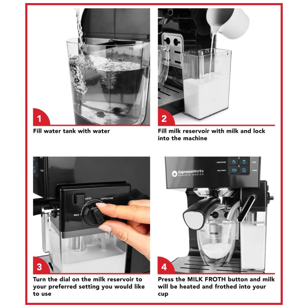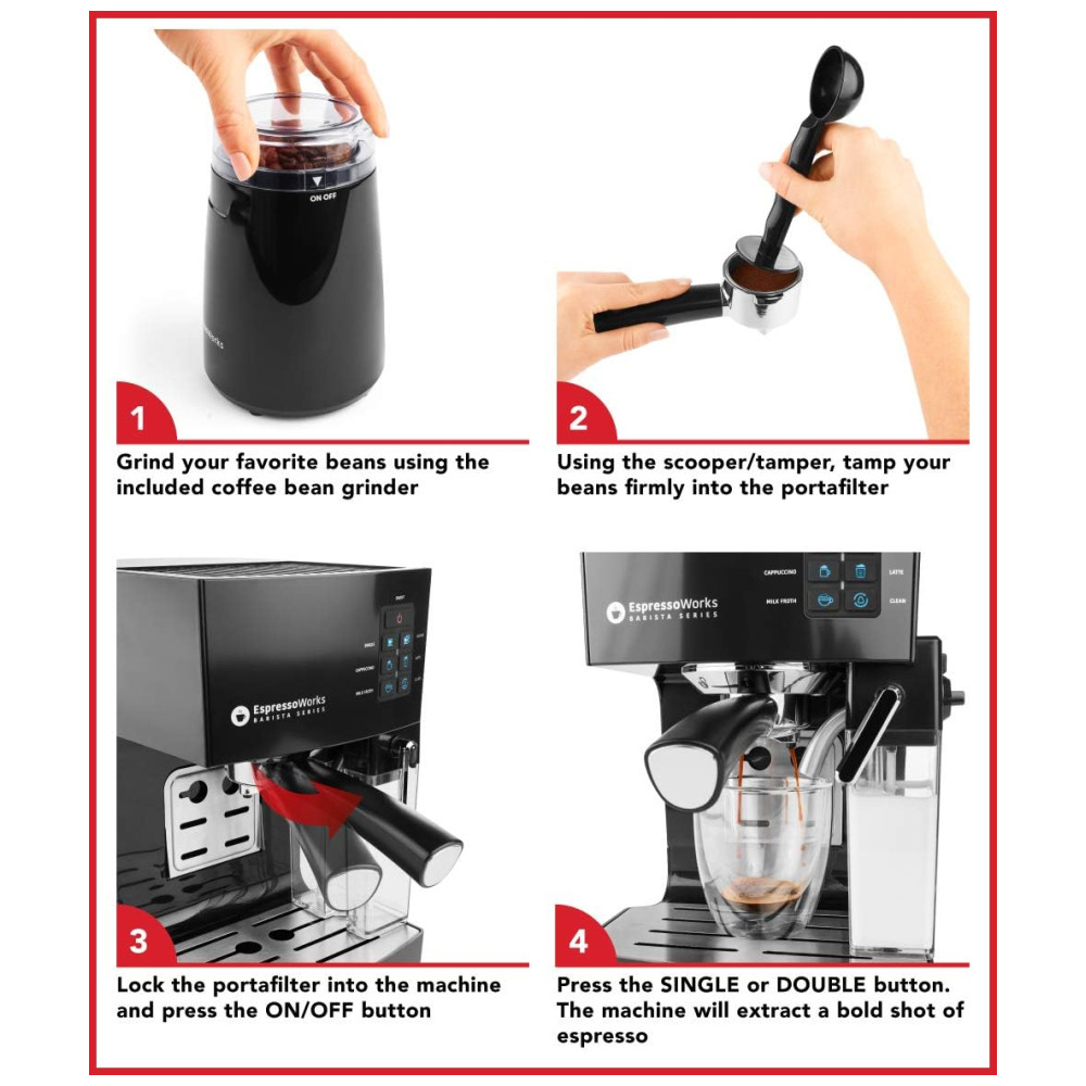 Equipado com o sistema avançado de aquecimento de termoblocos, basta clicar no botão LIGADO e apreciar o estilo italiano de café expresso, cappuccino, café com leite e muito mais em segundos. Basta adicionar grãos Tanque de água grande e destacável de 1,4L com alça conveniente para permitir recargas sem problemas. Batedor de leite e reservatório embutidos com botão de controle ajustável para aquecer e espumar o leite e desfrutar de um delicioso cappuccino e café com leite Máquina de café expresso e cappuccino da série Barista da EspressoWorks com moedor de café elétrico, acessórios Barista, copos de cappuccino de parede dupla e xícaras de café expresso. Esta poderosa máquina aprimora toda a sua experiência com café expresso, cappuccino e café com leite. A bomba de 19 barras cria o creme perfeito, e o sabor o nunca foi tão fácil. Moa seus próprios grãos de café ou café expresso com a textura perfeita, garantindo sempre a bebida mais fresca Colher e adulteração fácil de colher e medir a quantidade ideal de moagem de café expresso. 2 xícaras de café expresso de parede dupla premium e 2 copos de cappuccino de parede dupla de alta qualidade segure as xícaras sem queimar as mãos. Bandeja de aquecimento embutida. Portafilter de alta qualidade com cestas simples e duplas escolha sua quantidade e deixe a máquina fazer o resto. Cada cesto é gravado com uma linha MAX para garantir que a quantidade perfeita seja colocada. Batedor e reservatório de leite embutido com botão de controle ajustável Fácil de encher e limpar. Tanque de água destacável grande de 1.4L O suficiente para hospedar e servir Cada tanque cheio pode fazer até 19 doses de café expresso Tanque de água removível grande com alça fácil de transportar. Alça adicionada permite fácil remoção e reabasteça , limpe na pia. Batedor de leite e reservatório embutidos com botão de controle ajustável. Com apenas um toque, você pode apreciar as bebidas de café expresso em camadas perfeitas, com espuma densa, rica e duradoura em cada xícara do início ao fim. O reservatório de leite pode conter até 500ml de leite. Incluído na sua compra Moedor elétrico plug in de 120V. Porta filtro com alça de baquelite. Cestas de filtro de tiro único e duplo. Colher e adulteração 2 copos de cappuccino de parede dupla de alta qualidade 2 xícaras de café expresso de parede dupla premium 16 xícaras de café expresso de parede dupla premium 16 modelos de estêncil de arte para cappuccino. Guia de início rápido. Painel de controle. Escolha a configuração padrão ou programe sua própria quantidade perfeita de café expresso e leite. Sete botões dedicados com indicadores LED no painel de controle podem ajudá lo a preparar e criar uma lista de bebidas, básicas e personalizadas. Permite escolher uma dose única ou dupla para o seu café expresso, cappuccino ou latte macchiato. Máquina de café expresso e cappuccino com bocal embutido. 7 PC Máquina de café expresso e cappuccino all in one com batedeira a vapor e bocal embutido. Ótimo para amantes de café com leite, cappuccino e café, festas em casa, escritórios e gifting. Tempo de preparação para aquecimento 45 60 segundos. Sistema de aquecimento avançado com termobloco Steamer de leite. Espuma automática com tanque de leite removível. Espuma manual. Varinha de vapor. Capacidade do tanque de água 1.4L 1.25L. Acessórios Moedor de grãos de café, Colher, calcadeira, Portafilter, Cesta de filtro de tiro único, Cesta de filtro de tiro duplo, 2 xícaras de cappuccino, 2 xícaras de café expresso, Modelos de estêncil de arte. Duplo Cesta do filtro de injeção, 2 xícaras de café expresso em cerâmica, jarro para espuma de leite. Dimensões 21,5cm x 25,4cm x 30,5cm. A 25cm x 23cm x 29cm. Recurso de desligamento automático. Potência 1250W 1350W