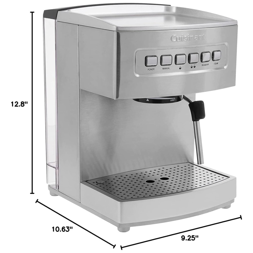 Estilo Programável. Prepare um expresso simples ou duplo usando expresso moído ou pastilhas com esta máquina de café expresso programável. Os 15 bares de pressão da unidade fornecem um café expresso consistentemente autêntico com excelente creme, enquanto seu bico de vapor de aço inoxidável facilita a transformação de uma bebida expresso em um cappuccino ou latte espumoso. Tamanhos de xícara pré programados incluem 44ml e 89ml. O reservatório de 1,9 litros da máquina de café expresso remove para facilitar o enchimento, e seu botão de vapor funciona separadamente para sua conveniência. Outros destaques incluem uma bandeja para aquecer xícaras na parte superior, uma pingadeira removível e tampa para facilitar a limpeza e um porta filtro com mecanismo de travamento, que permite bombear rapidamente os resíduos úmidos após cada uso. Os acessórios incluem um copo de espuma de aço inoxidável e uma ferramenta de compactação com uma colher de medida. Lindamente projetada em uma caixa profissional de aço inoxidável com um logotipo Cuisinart em relevo, a máquina de café expresso mede 27 x 24 x 33cm