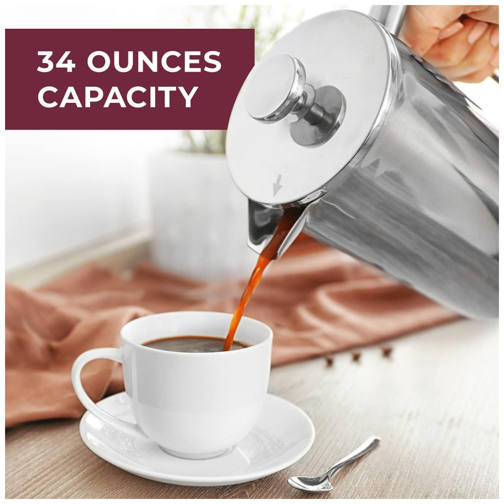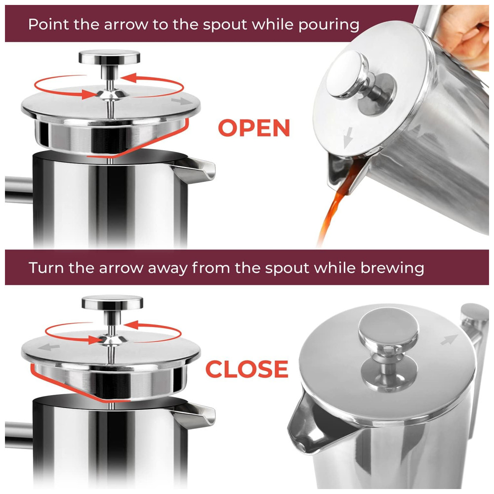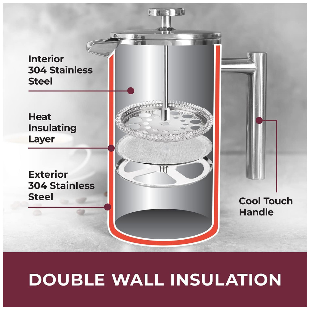 SE VOCÊ REALMENTE SE IMPORTA COM SEU CAFÉ Testamos mecanismos e filtros suficientes para fazer sua cabeça girar para ajustar e projetamos nossa impressora de maneira exclusiva com uma estrutura de filtro de três camadas para parar o sedimento, mas deixamos os deliciosos óleos de café passarem por todo o corpo, o café delicioso que fará de você um barista muito feliz. E, para compartilhar o amor pelo café, oferecemos a você uma caixa correspondente a bônus que contém grãos suficientes para dois lotes completos. 33 MAIS GROSSO, 20 MAIS PESADO, CONSTRUÍDO DURAMENTE Nossa jarra em aço inoxidável de dupla camada, classe 18, 304, de capacidade profissional, de enorme capacidade, manterá seu café quente por 60 minutos mais que os modelos de aço e vidro mais finos. E é à prova de queda, à prova de ferrugem e provavelmente à prova de balas seja legal. MULTI USO Além de usar a prensa francesa como cafeteira, também é o melhor aparelho para fazer chá, café com óleo mct, chocolate quente, fermentação fria, leite com espuma, leite com amêndoa, leite de caju, infusões de frutas e plantas e ervas. bebidas à medida que sela seus sabores e aromas. Perfeito para aquecimentos domésticos, casamentos, aniversários, feriados e todos os amantes de café , chá, entusiastas de bricolage e amantes de comida saudável Duas telas de aço inoxidável de bônus e o contêiner de viagem correspondente são incluídos
