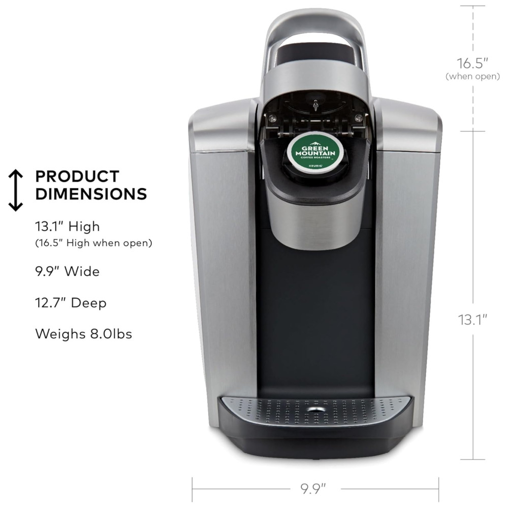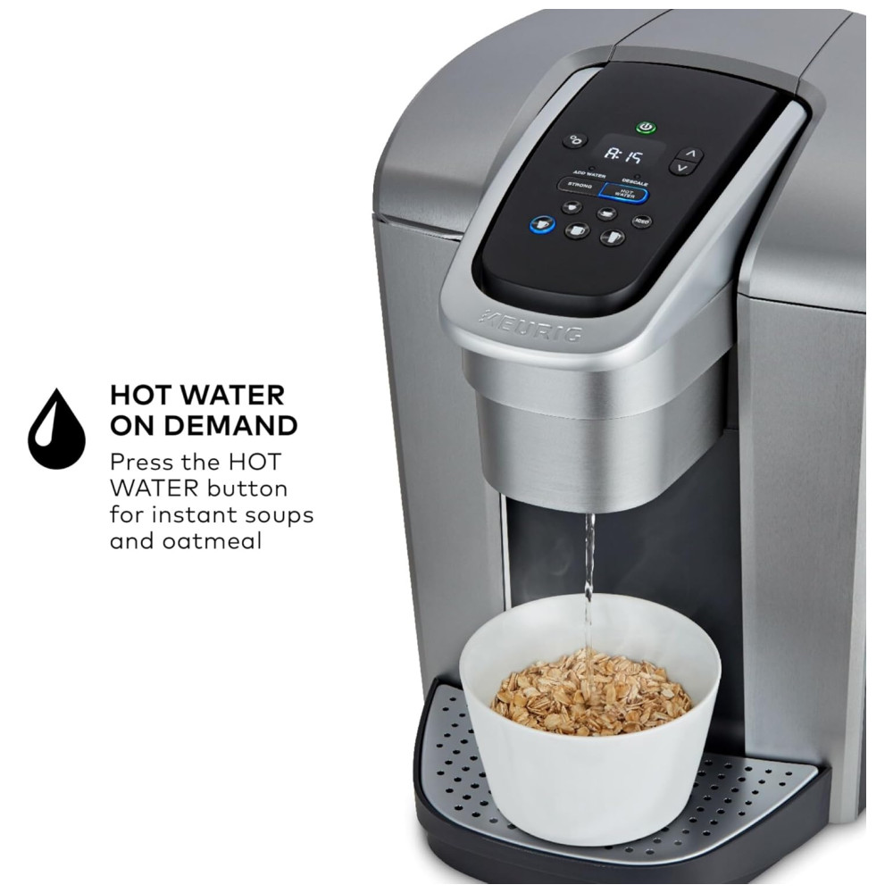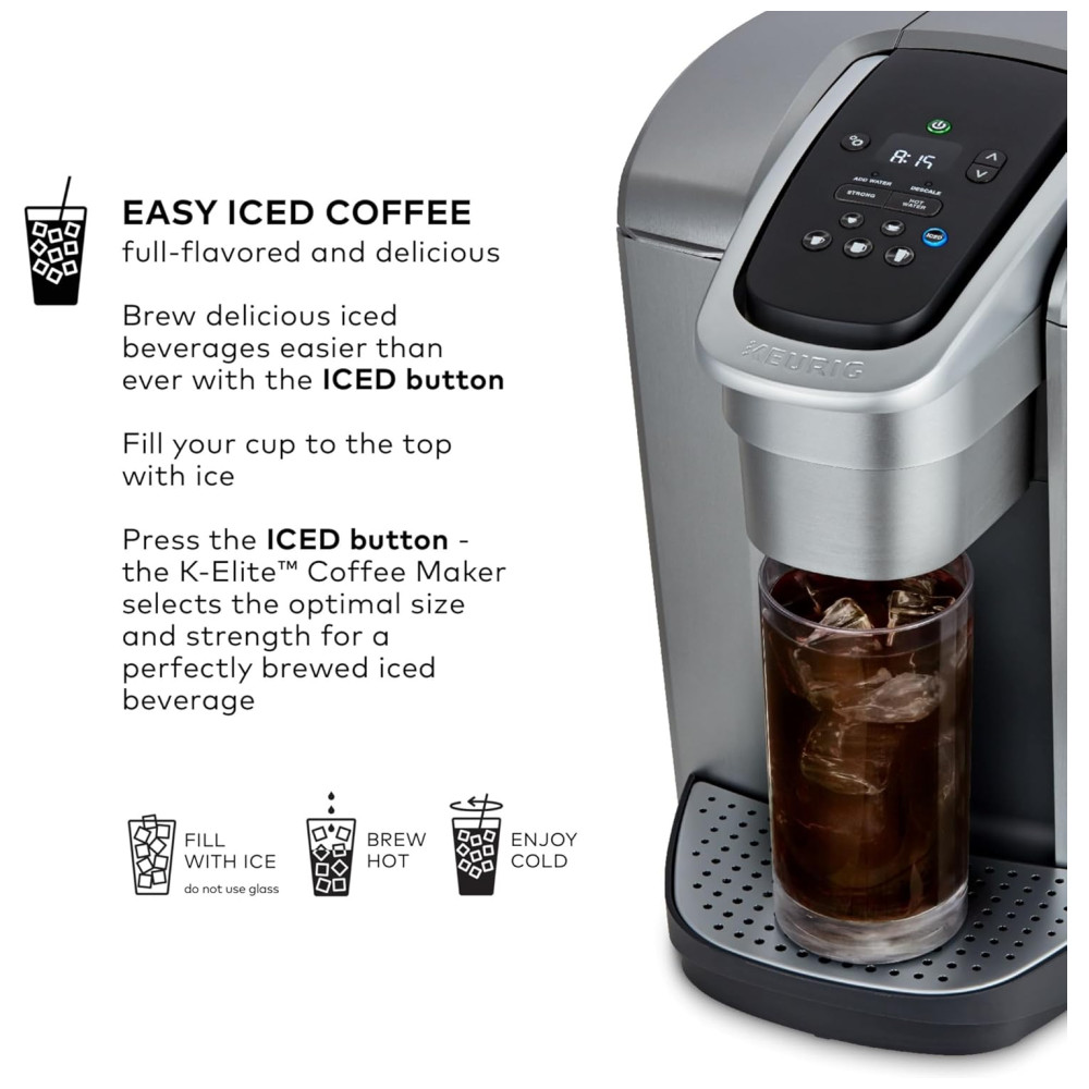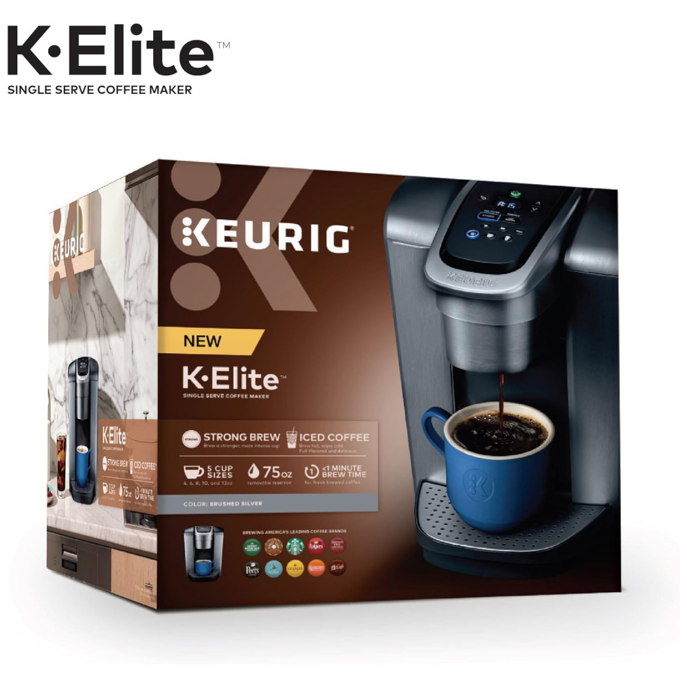 Cor Cinza. A cervejaria Keurig K Elite combina um acabamento premium e recursos programáveis para oferecer design moderno e o máximo em personalização de bebidas. Com um acabamento escovado impressionante e detalhes de metal, é uma adição elegante a qualquer cozinha. A cafeteira Keurig K Elite serve Strong Brew para quando você deseja preparar uma xícara de café mais ousada e um botão Iced para fazer quente sobre gelo para um café gelado refrescante e saboroso. Possui cinco tamanhos de café, para que você possa preparar seu café, chá, chocolate quente ou bebida gelada favorita com o toque de um botão. Escolha entre centenas de deliciosas variedades de cápsulas K Cup ou prepare seu próprio café moído usando o filtro de café reutilizável Universal My K Cup vendido separadamente. A cervejaria K Elite oferece recursos programáveis como controle automático de temperatura e temperatura, além de fornecer água quente sob demanda para sopas instantâneas e aveia, e o grande reservatório de água removível de 2 Litros permite preparar 8 xícaras entre as recargas
