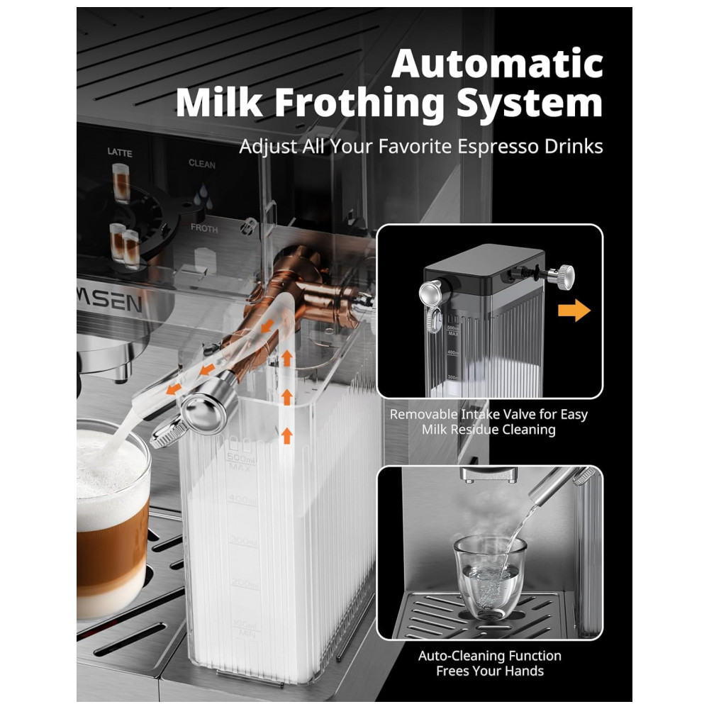 A máquina utiliza sistema de dupla caldeira, com aquecedor de 1350W dedicado à extração do café e outro de 1000W para vaporização do leite, permitindo aquecimento rápido e estável para bebidas à base de espresso. O espumador automático de leite executa vaporização e formação de espuma diretamente na xícara, dispensando o uso de varinha manual e facilitando a limpeza graças ao reservatório removível. A bandeja de gotejamento removível comporta xícaras de até aproximadamente 10,4 cm de altura e auxilia na coleta de resíduos líquidos.