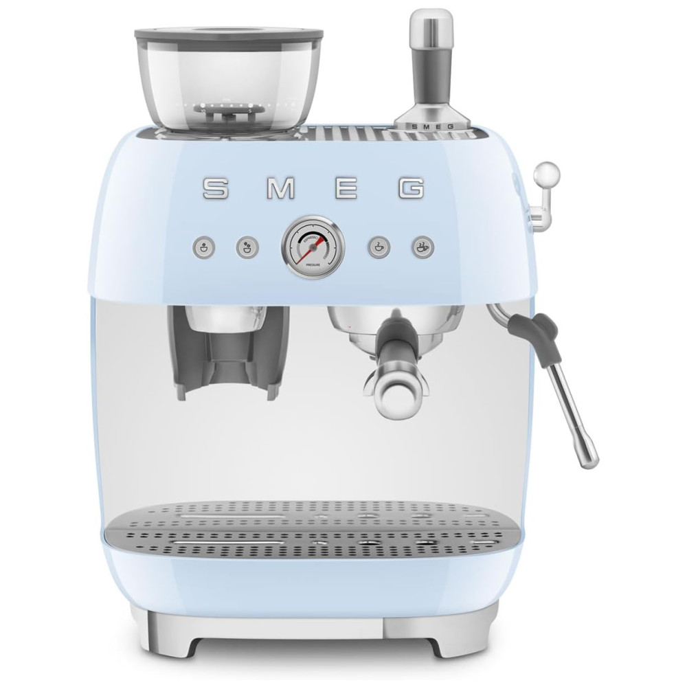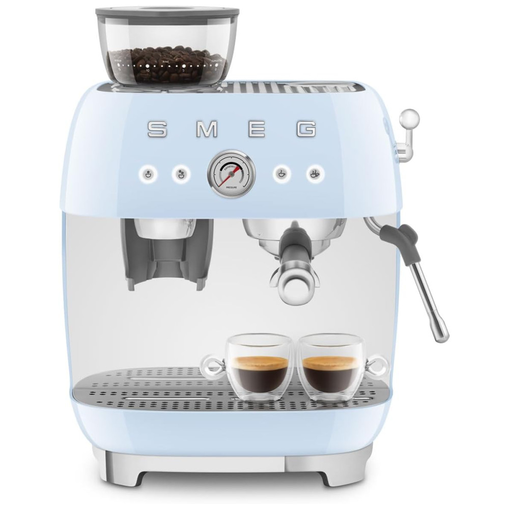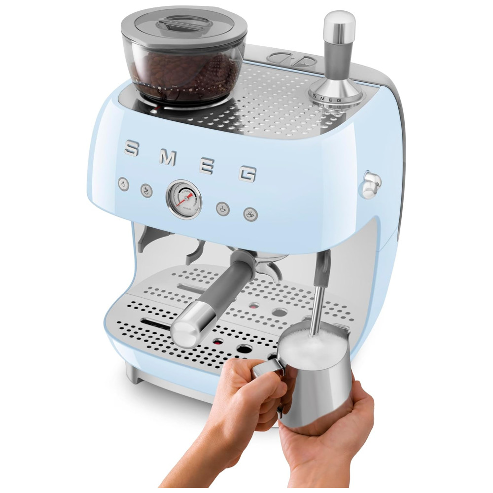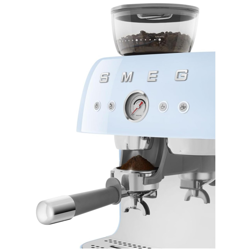 Desfrute de um café espresso perfeito todas as manhãs com a Máquina de Café Espresso Semiautomática Smeg Retro em Azul Pastel. Esta máquina manual é capaz de preparar tanto cafés espressos simples quanto duplos. Possui um moedor cônico integrado que pode ser ajustado para moer o café de forma grossa a super fina. Um manômetro de pressão está incluído para monitorar o desempenho da extração. Com controles fáceis de usar, possui dois botões para moagem e dois para preparo do café. Oferece alertas visuais e sonoros para garantir um desempenho impecável. O sistema duplo de Thermoblock aquece rapidamente para uma eficiente preparação e vaporização. Para eficiência energética, inclui a função de desligamento automático. Pés antiderrapantes garantem estabilidade durante o uso. Além disso, possui um aquecedor de xícaras passivo. O pacote inclui um kit de limpeza, uma fita de teste de dureza da água, um jarro de leite e um socador de aço inoxidável, bem como quatro filtros. Este conjunto conta com dois filtros não pressurizados para moagem, dosagem e compactação, e dois filtros pressurizados para café pré-moído.