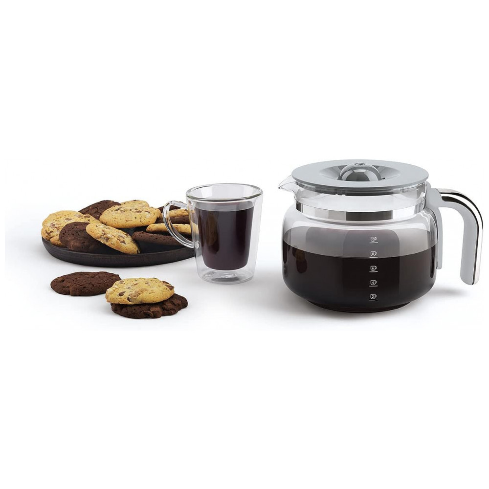 Conteúdo da caixa: Cafeteira gotejamento Smeg DCF02PGUK, jarra de vidro com alça e tampa, filtro permanente com alça, medida de dosagem