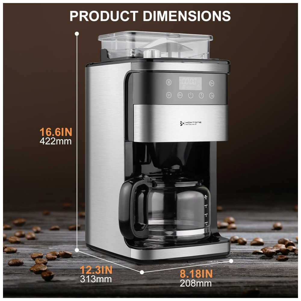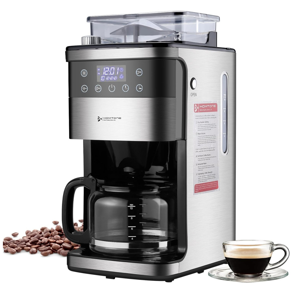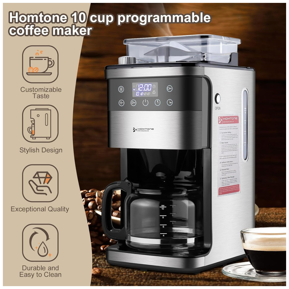 Cafeteira Programável 10 Xícaras com Moedor de Café Integrado 110V 950W Homtone Preta e Aço Inoxidável