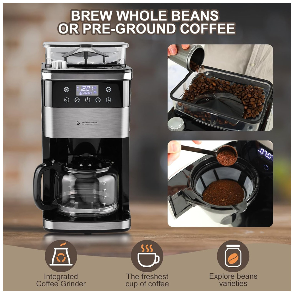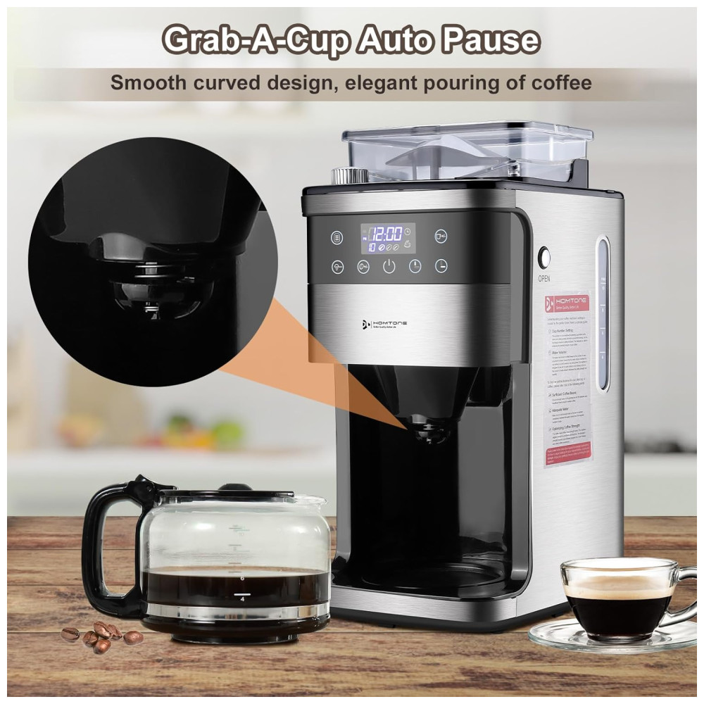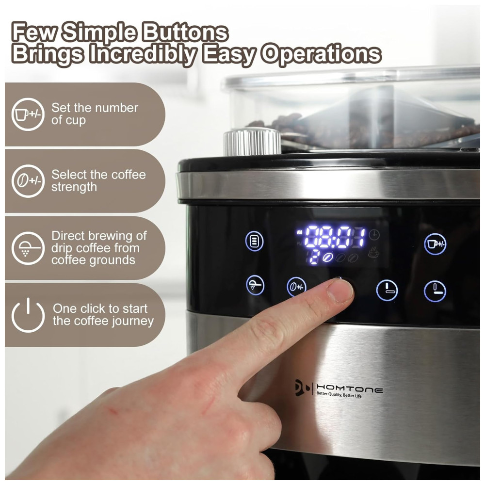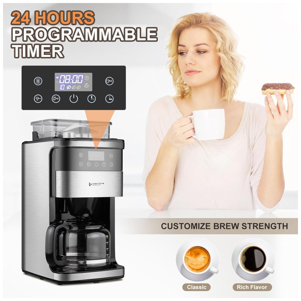 Cafeteira Programável 10 Xícaras com Moedor de Café Integrado 110V 950W Homtone Preta e Aço Inoxidável