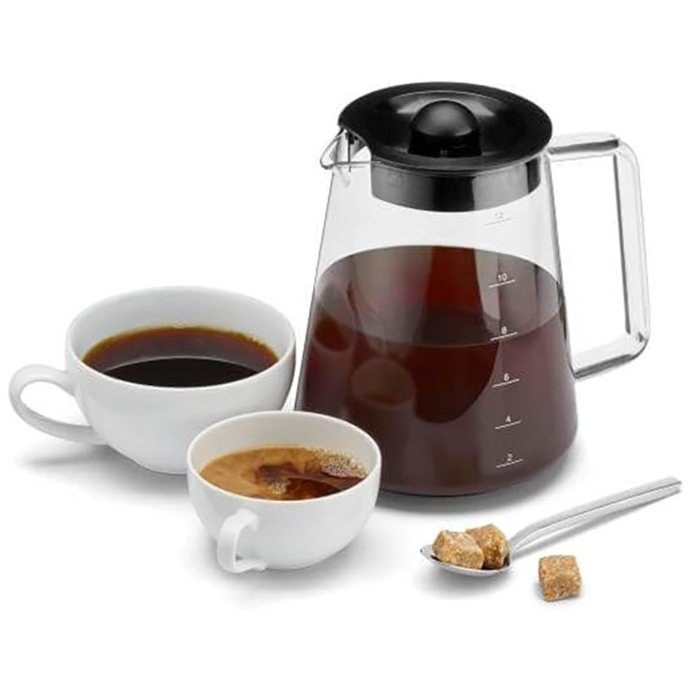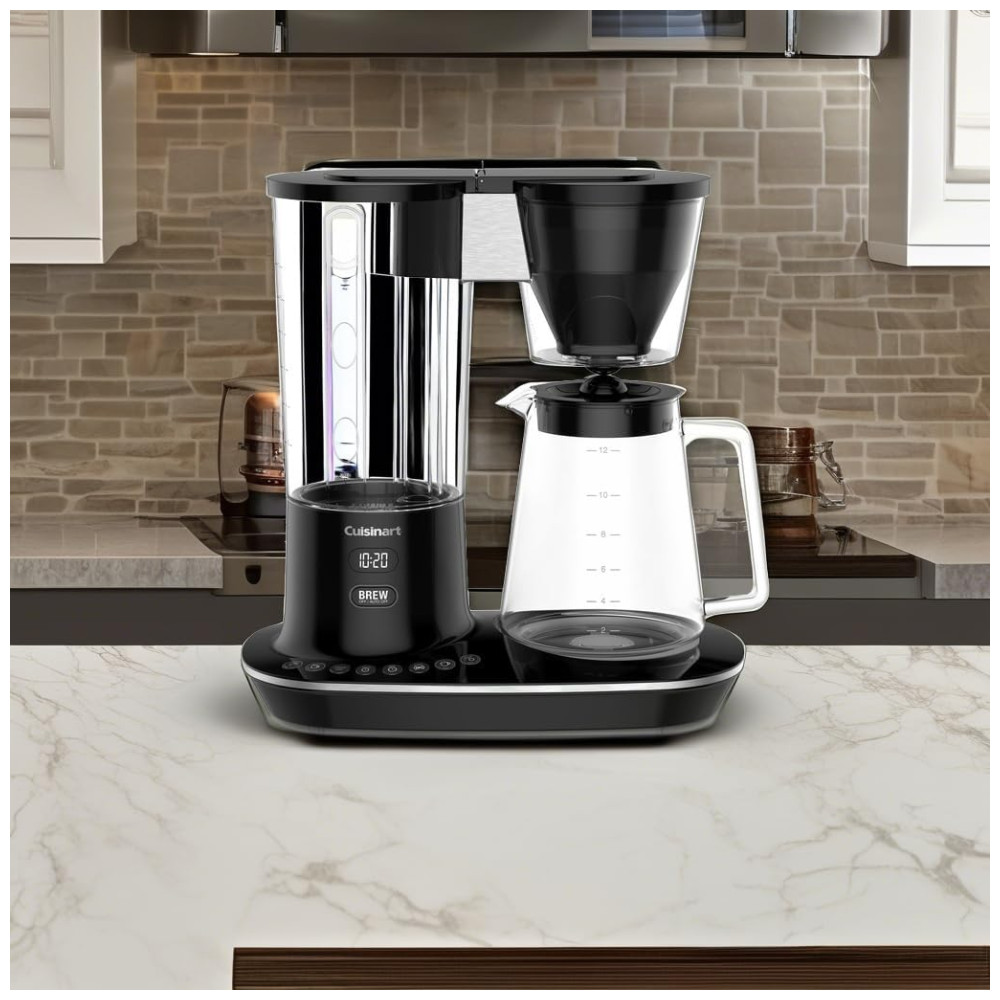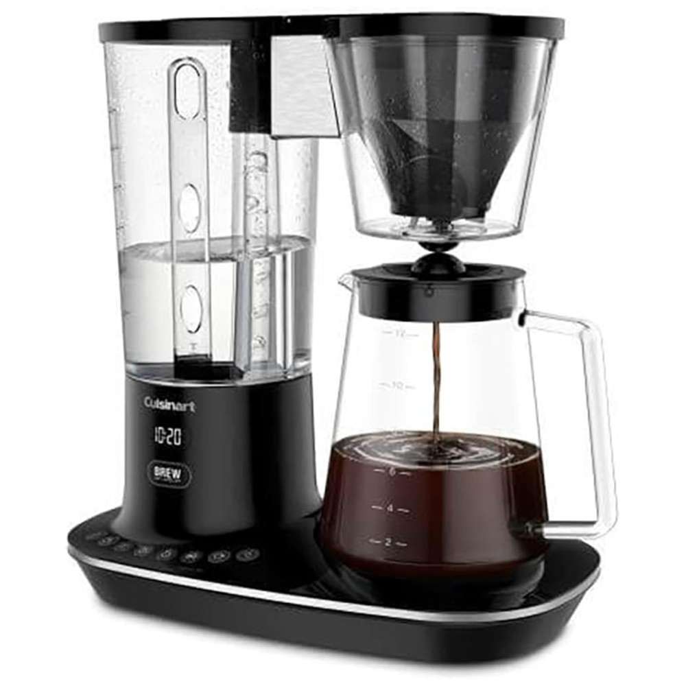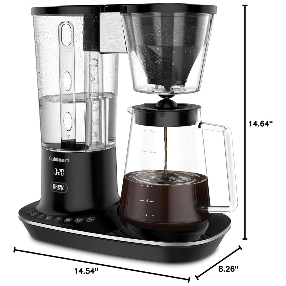 A jarra de vidro para 12 xícaras possui uma alça ergonômica preta com corpo preto correspondente para combinar perfeitamente com seus eletrodomésticos de cozinha. A janela de água Easytoview permite um enchimento preciso e o recurso Brew Pause, marca registrada da Cuisinart, permite que você desfrute de uma xícara de café antes que o ciclo de preparação termine.