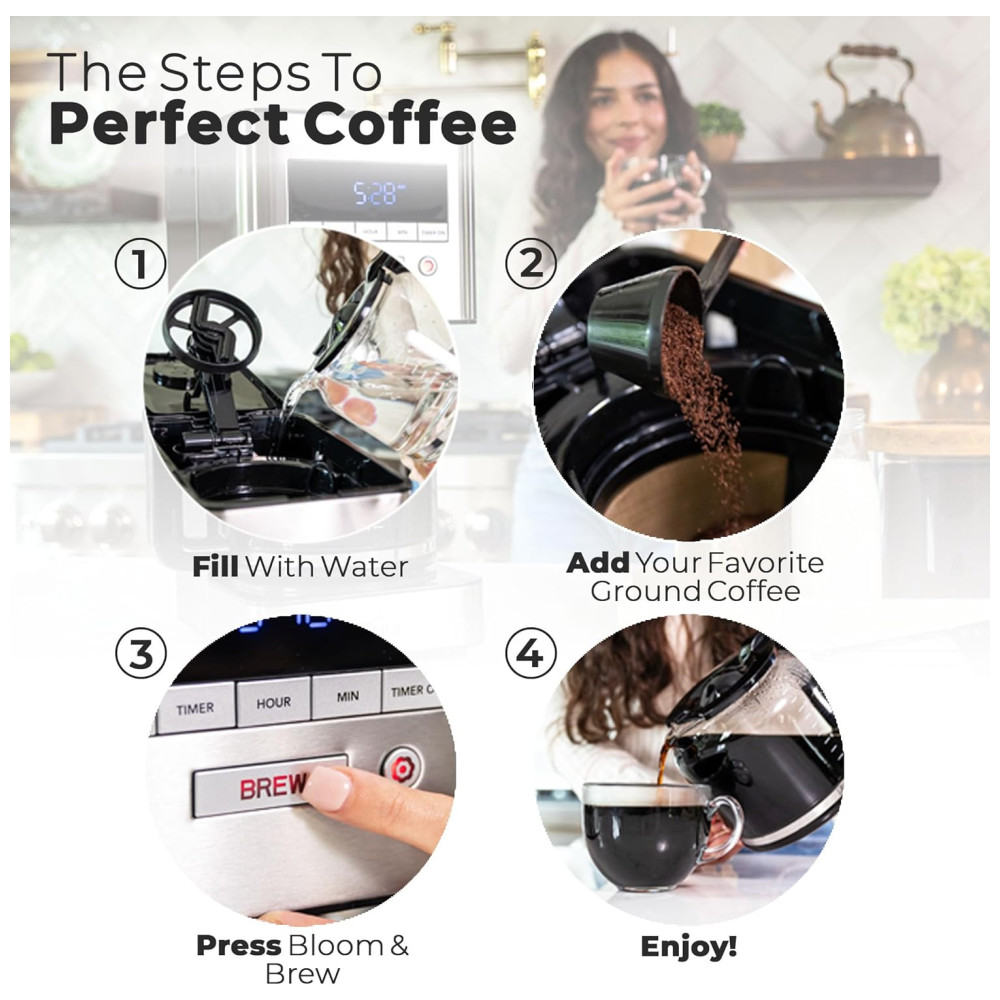 Wake to Brew Timer: Programe a cafeteira para começar a preparar antes de você acordar, garantindo uma xícara quente e fresca assim que você precisar.
