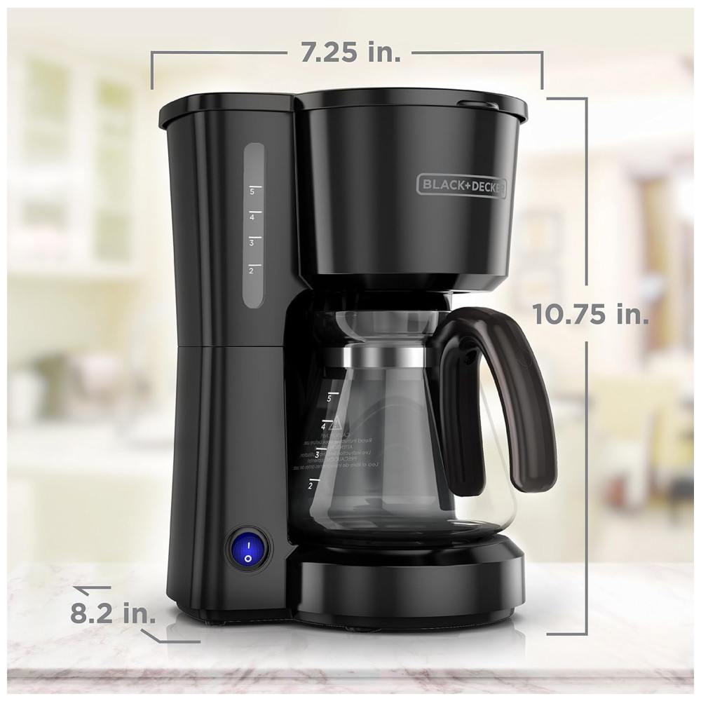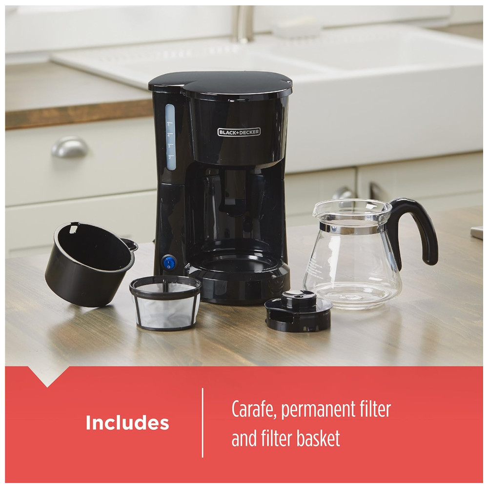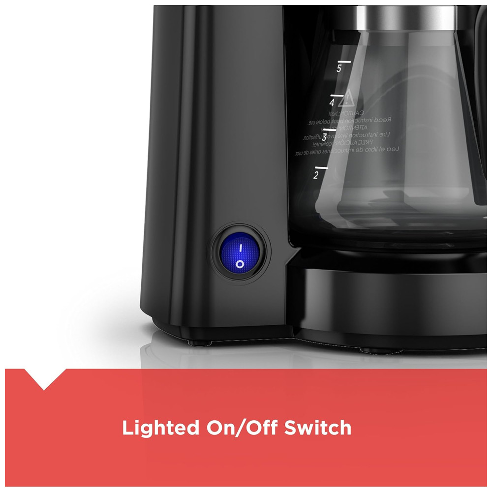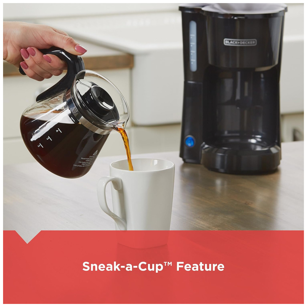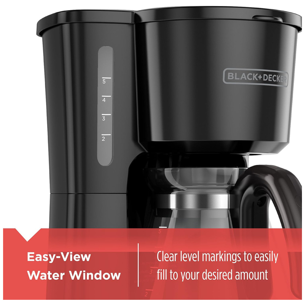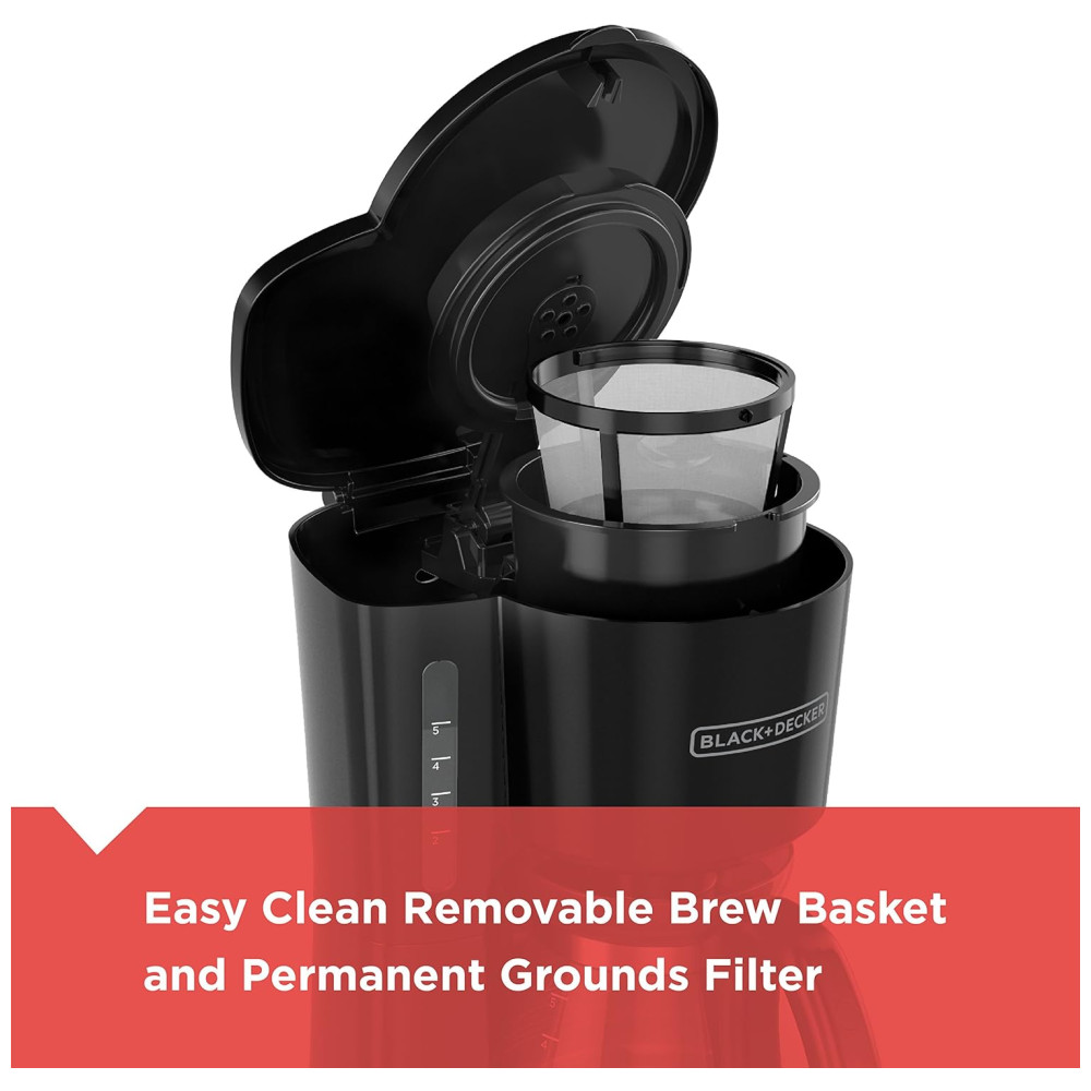 Café delicioso, fácil de fazer A cafeteira BLACKDECKER para 5 xícaras funciona com o toque de um botão, aquecendo a água até a temperatura ideal para extração total do sabor. O café é preparado na jarra de vidro Duralife, projetada para manuseio confortável e vazamento sem gotejamento. Além disso, o filtro permanente elimina a necessidade de filtros de papel bagunçados