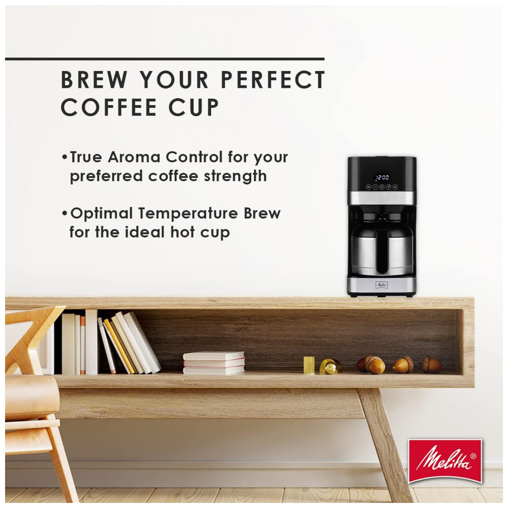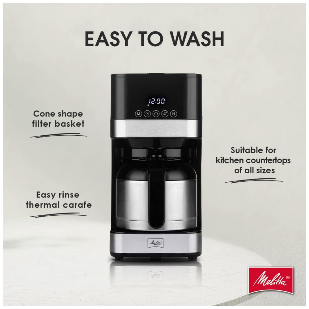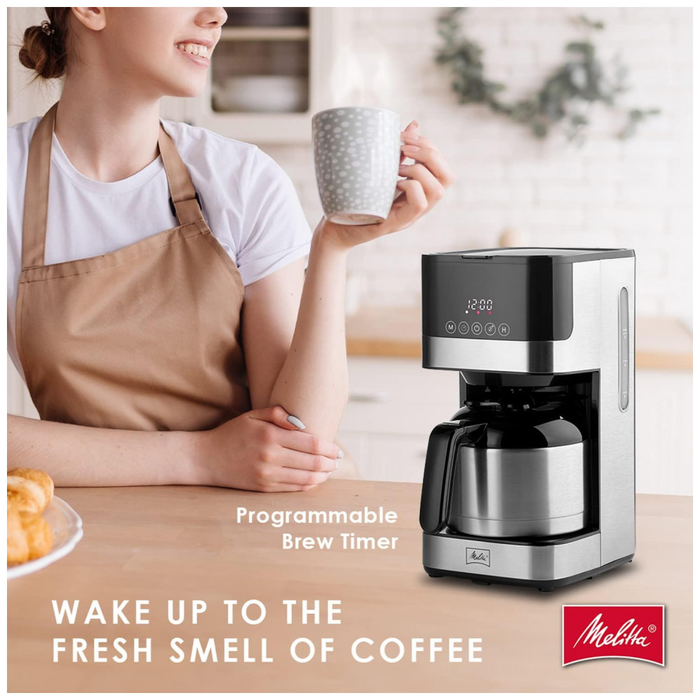 ACORDE COM O CHEIRO FRESCO DO CAFÉ Melitta Aroma Tocco Thermal Drip Coffee Maker é uma cafeteira programável especialmente projetada para fazer seu café funcionar antes de você. Graças ao seu timer de preparação programável construído com um grande painel de controle de toque de vidro LCD, ele pode facilmente preparar até 8 xícaras em sua cafeteira térmica quando você se levanta de manhã.