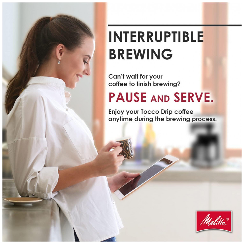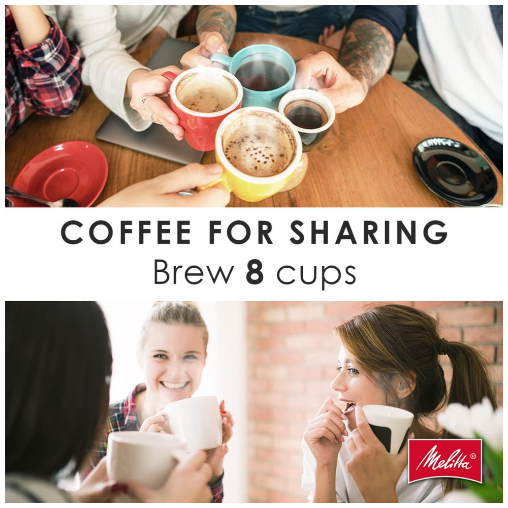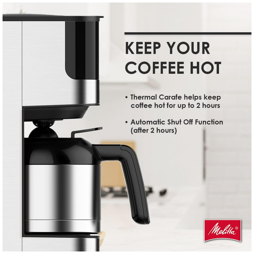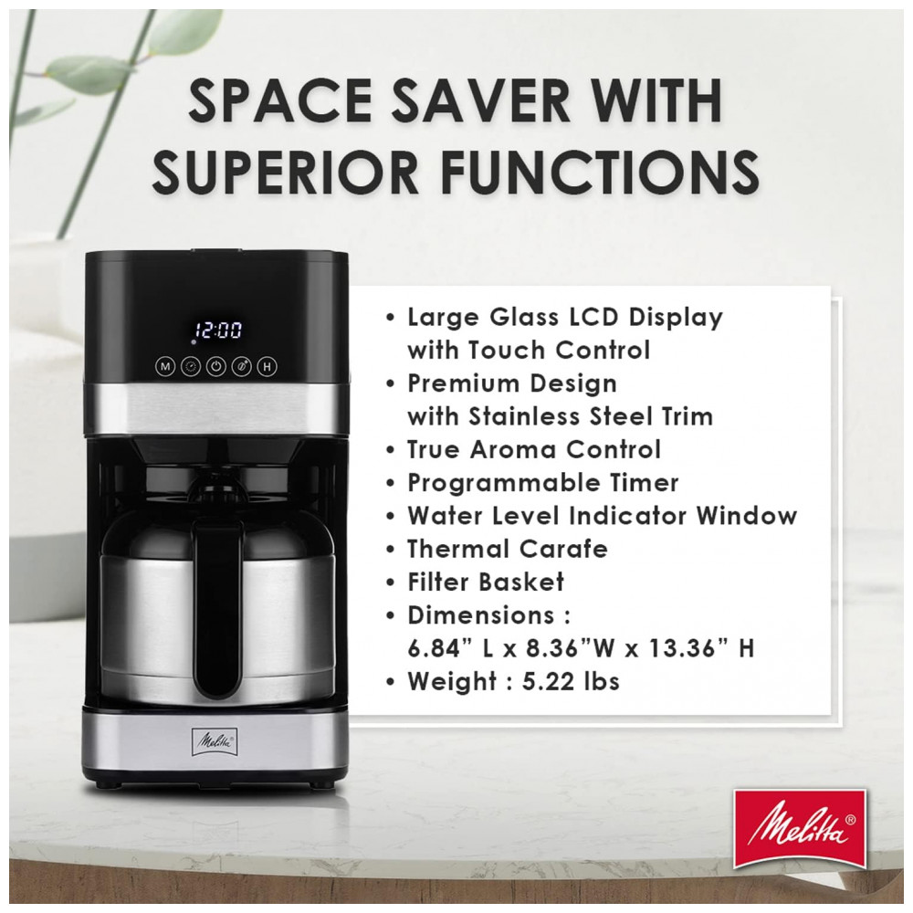 ACORDE COM O CHEIRO FRESCO DO CAFÉ Melitta Aroma Tocco Thermal Drip Coffee Maker é uma cafeteira programável especialmente projetada para fazer seu café funcionar antes de você. Graças ao seu timer de preparação programável construído com um grande painel de controle de toque de vidro LCD, ele pode facilmente preparar até 8 xícaras em sua cafeteira térmica quando você se levanta de manhã.