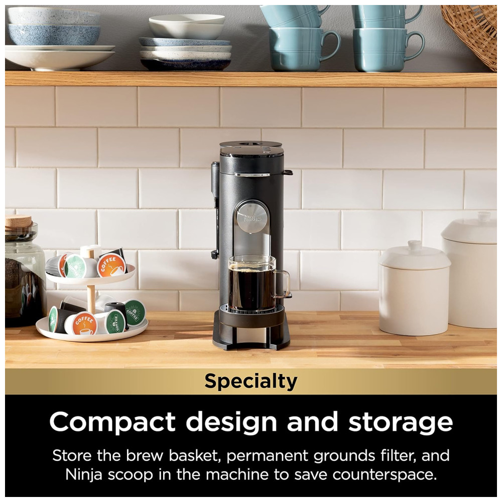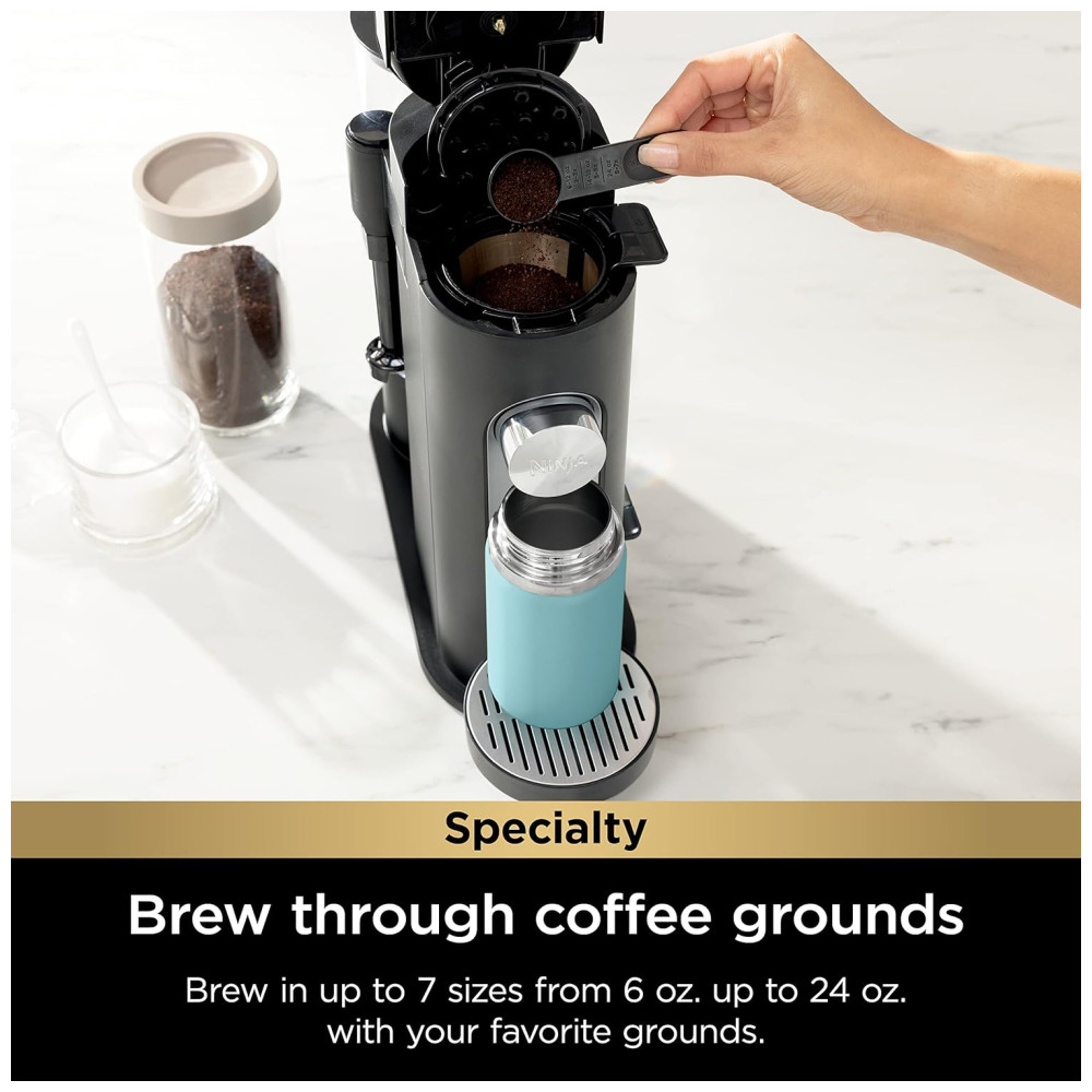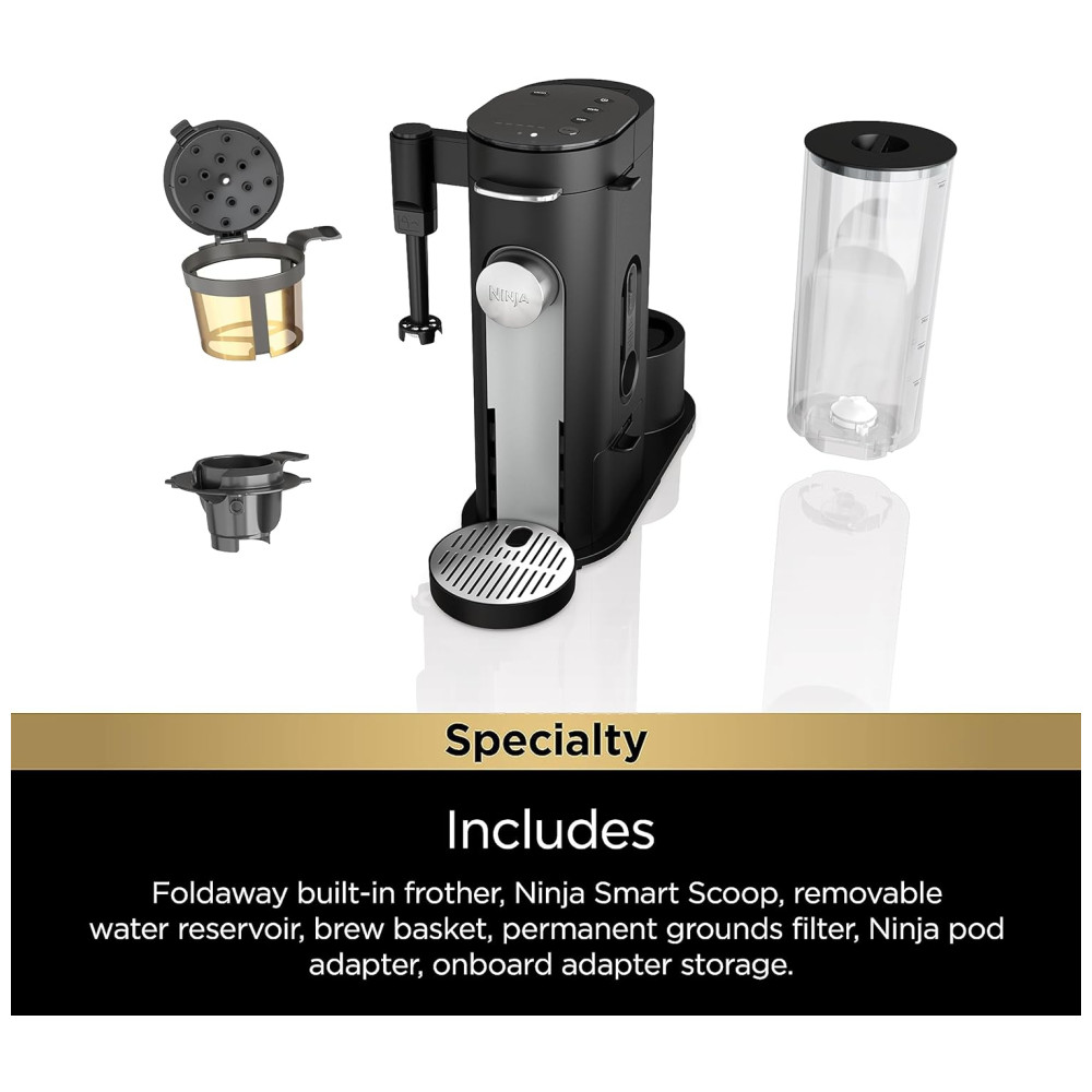 O QUE ESTÁ INCLUÍDO A cafeteira vem com um bocal embutido, uma colher de medição Ninja, uma cesta de infusão removível, um adaptador de cápsula Ninja e um filtro permanente