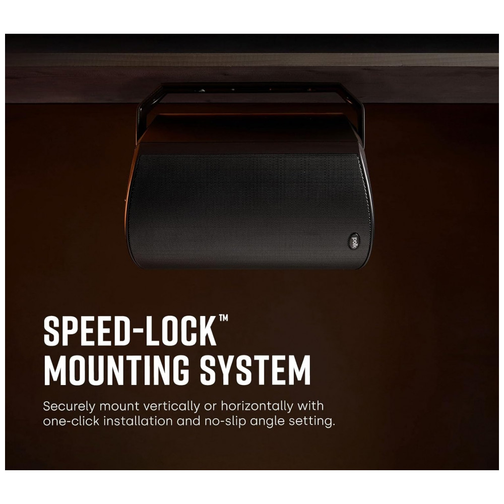 Os gabinetes em plástico de alta resistência com grade metálica tratada contra corrosão são projetados para suportar chuva, sol e variações de temperatura em aplicações all‑weather. O sistema de montagem Speed‑Lock permite instalação em parede na posição vertical ou horizontal, com ajuste de inclinação para direcionar o som conforme o layout do ambiente.