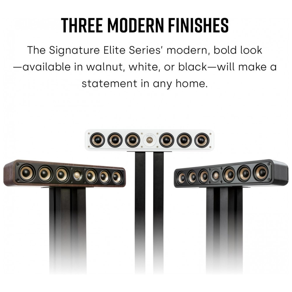 O gabinete em MDF, a grade frontal magnética antidifração e os terminais de conexão banhados a ouro contribuem para reduzir ressonâncias e perdas de sinal, mantendo a reprodução mais neutra. A caixa pode atuar como canal central ou como canais frontais esquerdo e direito em configurações 3.1, 5.1 ou superiores, com montagem sobre móveis ou em parede via furação tipo keyhole, preservando a assinatura tímbrica da linha Signature Elite para combinação com torres e surrounds da mesma série.