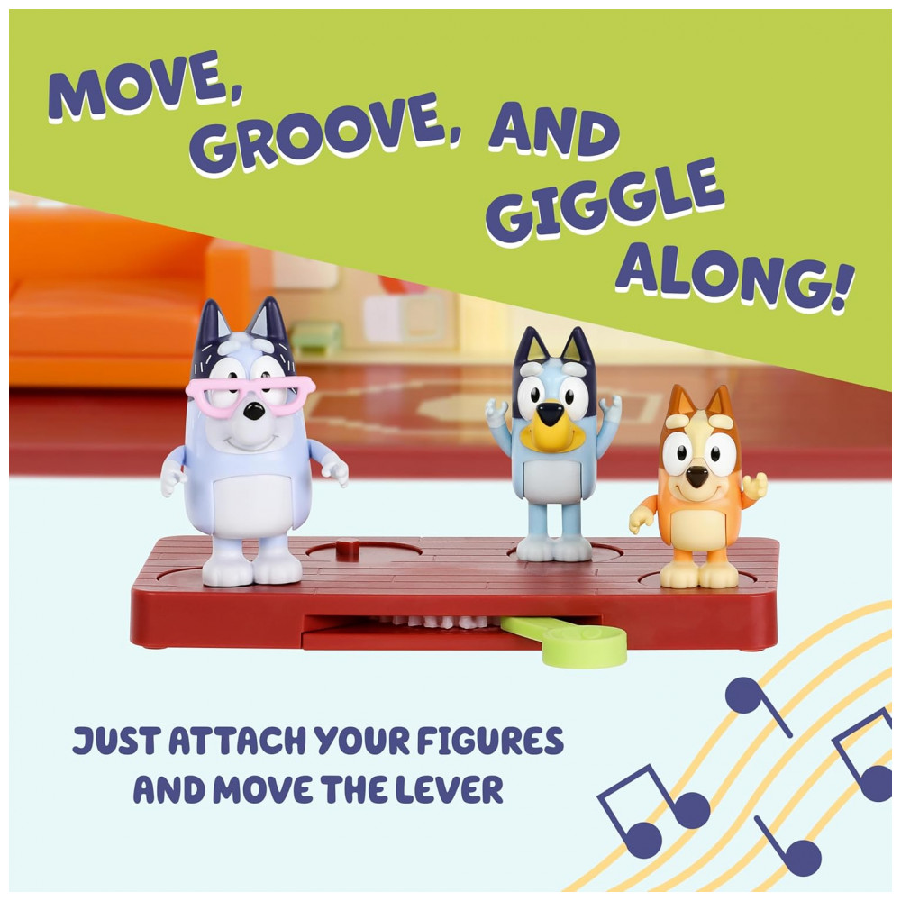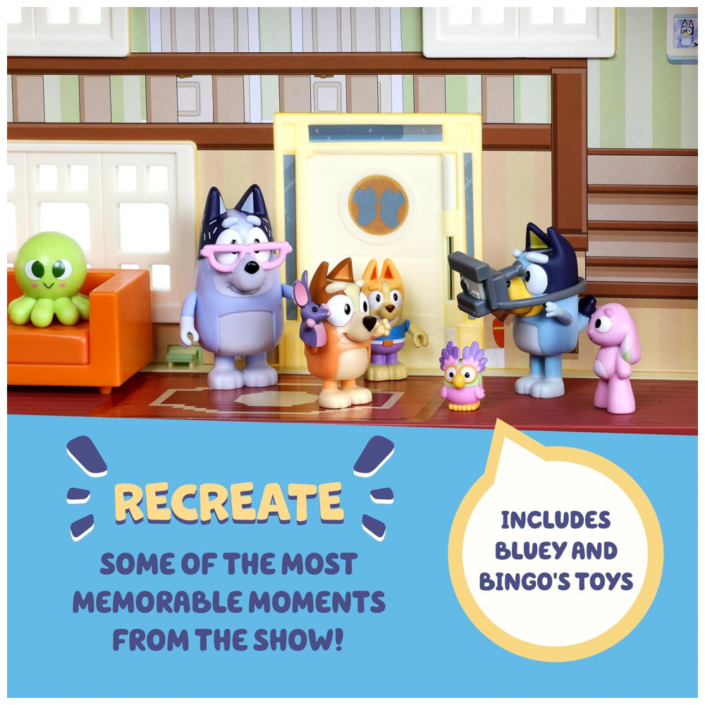 Pressione o polvo no quarto das crianças para ativar luzes e mais de 50 sons e frases, incluindo uma pista de dança em movimento. As figuras de Bingo, Bluey e Nana são articuladas e possuem braços e corpo móveis, tornando as ideais para as mãos da pré escola se moverem e brincarem. Este brinquedo é recomendado para maiores de 3 anos.