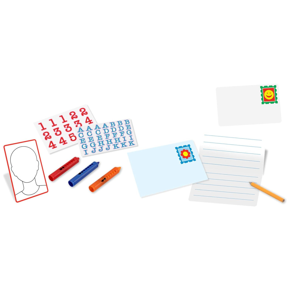 A porta articulada se abre para dar espaço para dois cartões postais e uma carta pautada e um envelope, todos reutilizáveis com os lápis de limpeza que acompanham o conjunto.