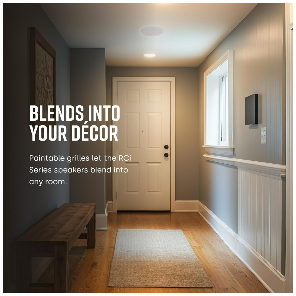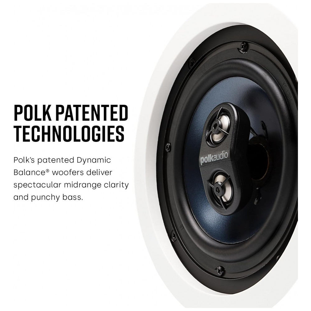 A Polk Audio RC6s é uma caixa de embutir no teto que reproduz som estéreo (canais esquerdo e direito) a partir de um único ponto, ideal para banheiros, cozinhas, corredores e varandas cobertas, onde não se quer múltiplos alto‑falantes aparentes. Ela utiliza um woofer de 16,5 cm e dois tweeters de 1,9 cm, entregando som com boa presença de graves, médios suaves e agudos claros em um único ponto no teto.