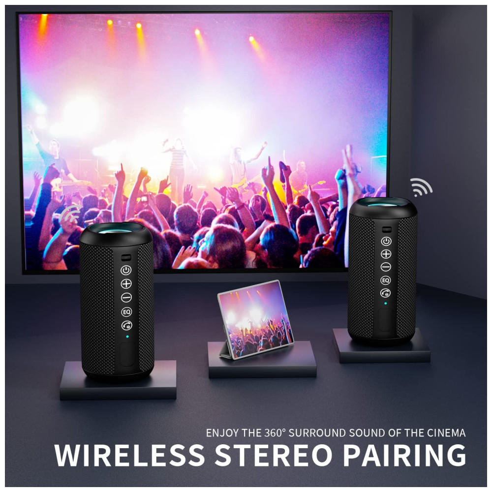 Som estéreo Hi Fi e função de emparelhamento duplo O alto falante bluetooth é equipado com 24 W de alto falante de drivers de áudio estéreo e processador de sinal digital avançado, que emite agudos nítidos, médios detalhados e graves especialmente aprimorados em qualquer volume. Você pode comprar dois alto falantes ao mesmo tempo para desfrutar verdadeiramente do som surround de uma sala de cinema usando a função Dual Pairing, uma experiência auditiva verdadeiramente incomparável.