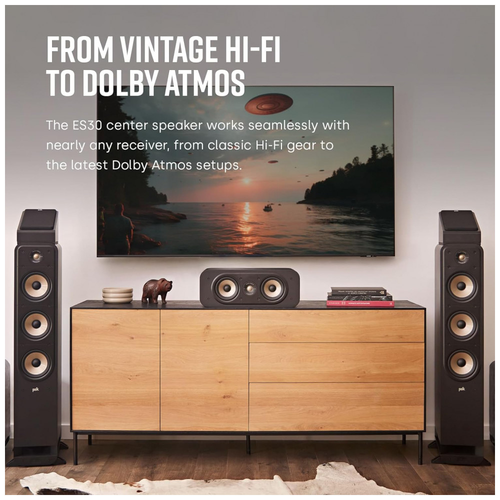 A Polk Audio Signature Elite ES30 é uma caixa acústica central passiva para home theater, certificada Hi-Res Audio e compatível com Dolby Atmos e DTS:X quando utilizada com receivers adequados. Ela utiliza dois woofers de 13,3 cm em polipropileno reforçado com mica e um tweeter de 2,5 cm em Terylene, com arranjo acústico balanceado e crossovers de precisão para oferecer diálogos claros, médios detalhados e boa presença de graves na reprodução de filmes, séries, jogos e música multicanal.