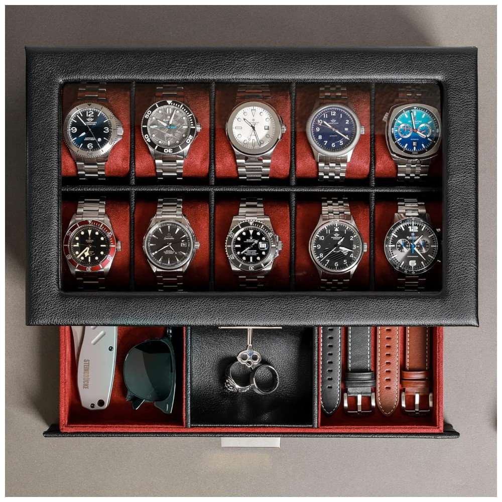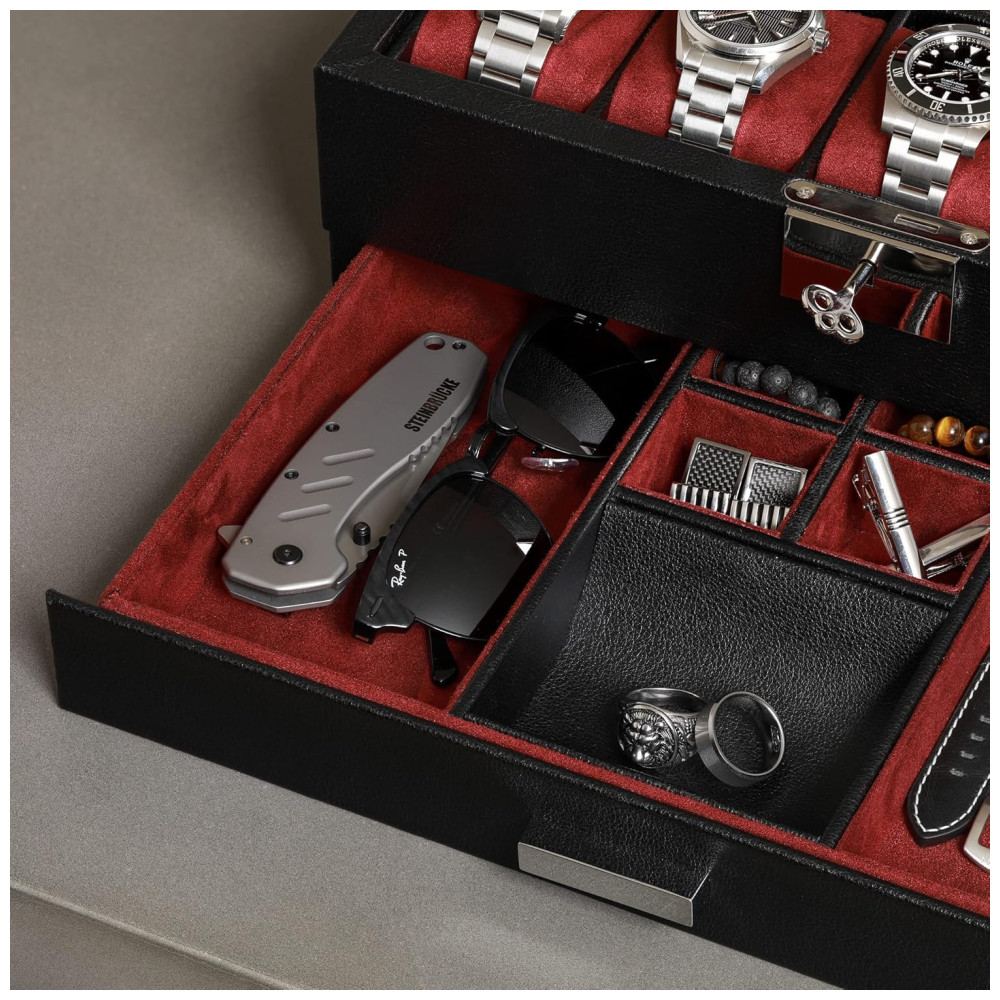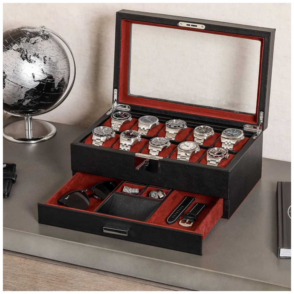 Caixa Estojo de Couro com Gaveta de Manobrista para Relógios com 10 Compartimentos ROTHWELL Preto e Vermelho
