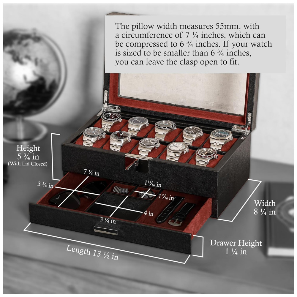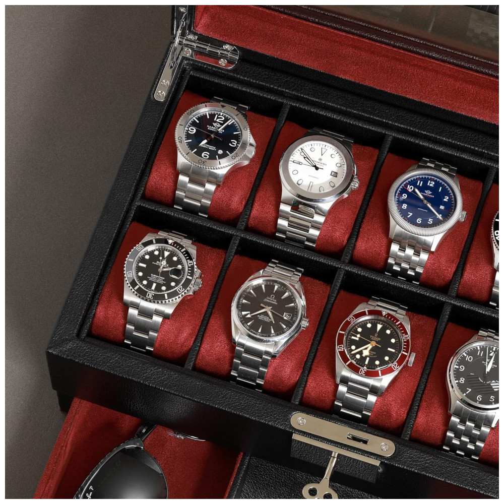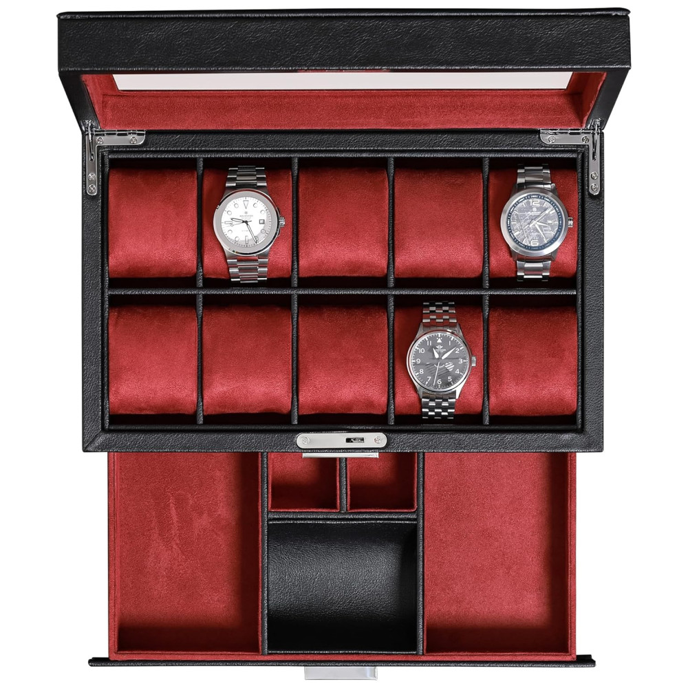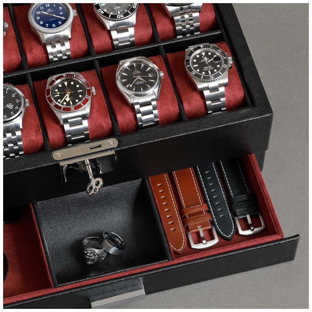 Caixa Estojo de Couro com Gaveta de Manobrista para Relógios com 10 Compartimentos ROTHWELL Preto e Vermelho