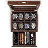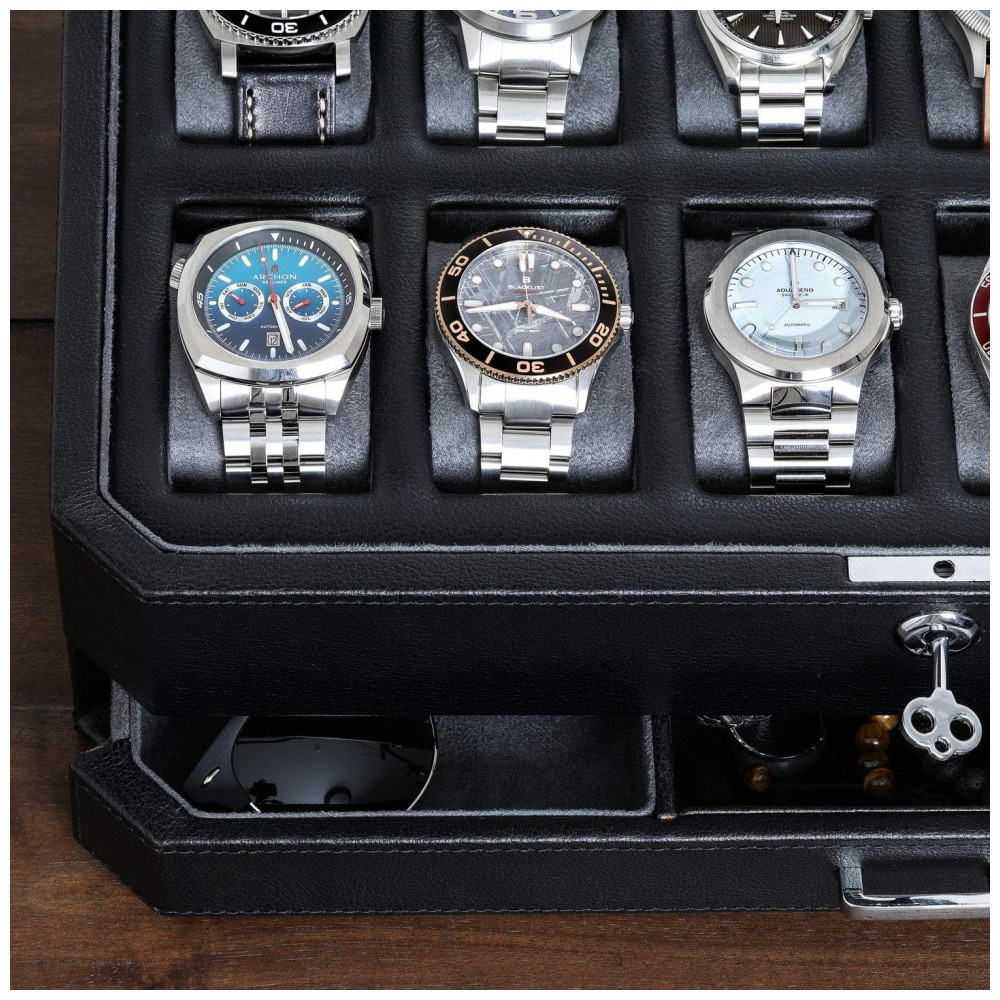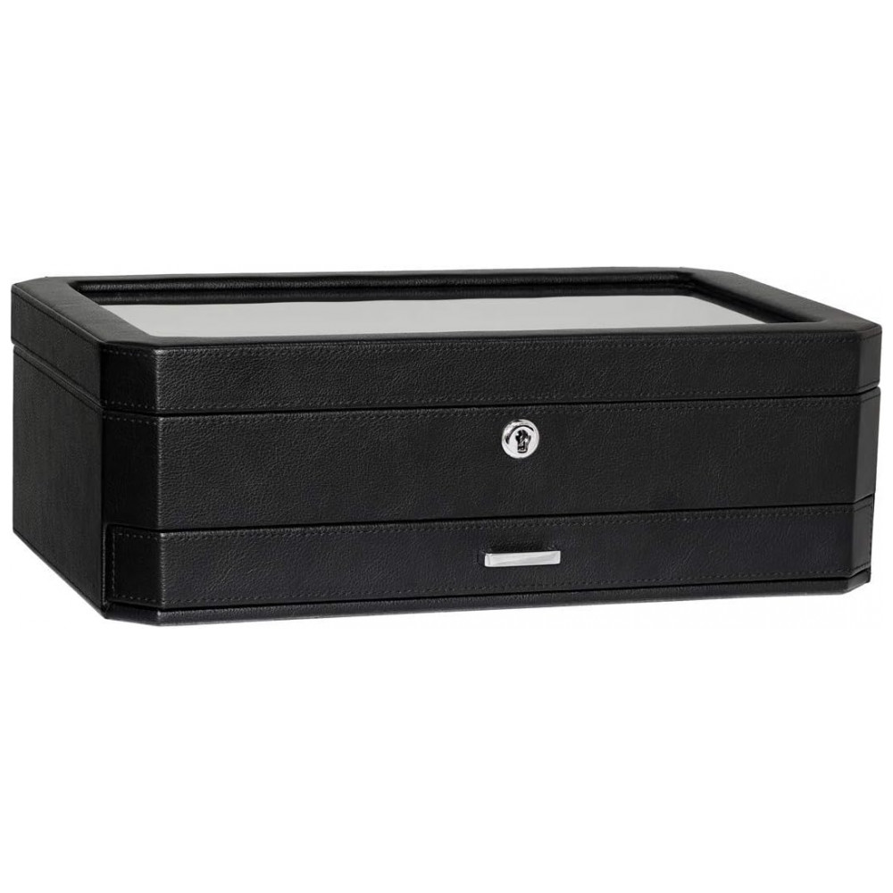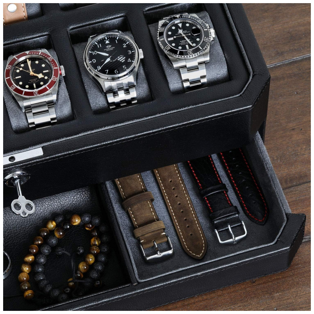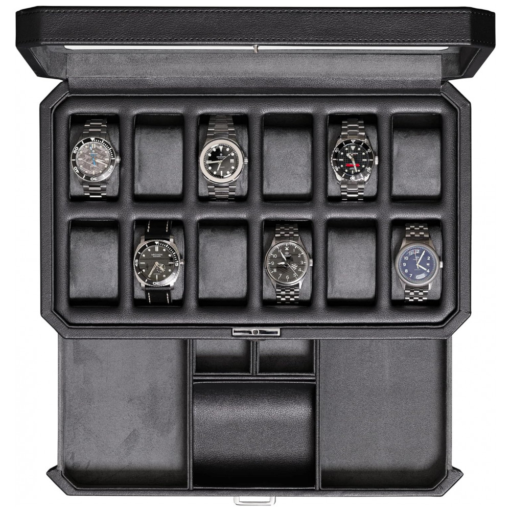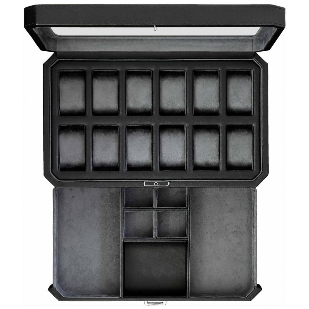 Caixa Estojo de Couro com Gaveta de Manobrista para Relógios com 12 Compartimentos ROTHWELL Preto e Cinza