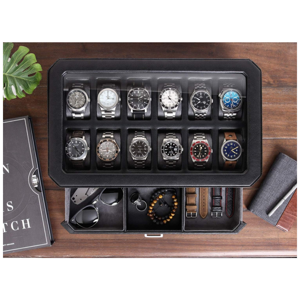DOZE SLOTS Com doze 12 slots, nossas caixas e organizadores de joias oferecem muito espaço para zenar toda a sua coleção de relógios. Nossa caixa de zenamento com tampa fica ótima enquanto atua como uma caixa de relógio linda e deslumbrante.