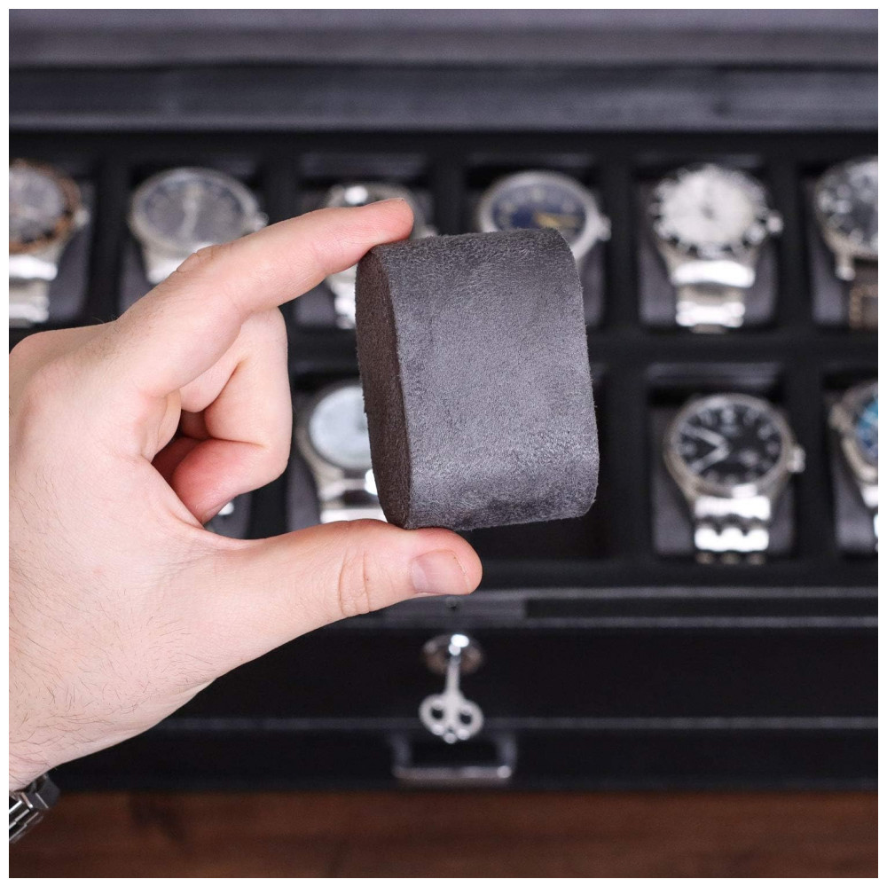 CUIDADOS DE EXIBIÇÃO DE RELÓGIO PARA HOMENS E MULHERES Cada almofada em nosso organizador de relógios mantém um relógio pequeno ou grande até perfeitamente no lugar um ao lado do outro e cabe em relógios de tamanho de 16,5 centímetros e acima. Além disso, há muito espaço entre a tampa e as almofadas do nosso porta relógios para acomodar relógios de todos os tamanhos.