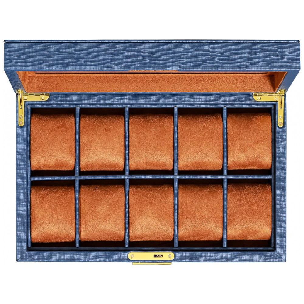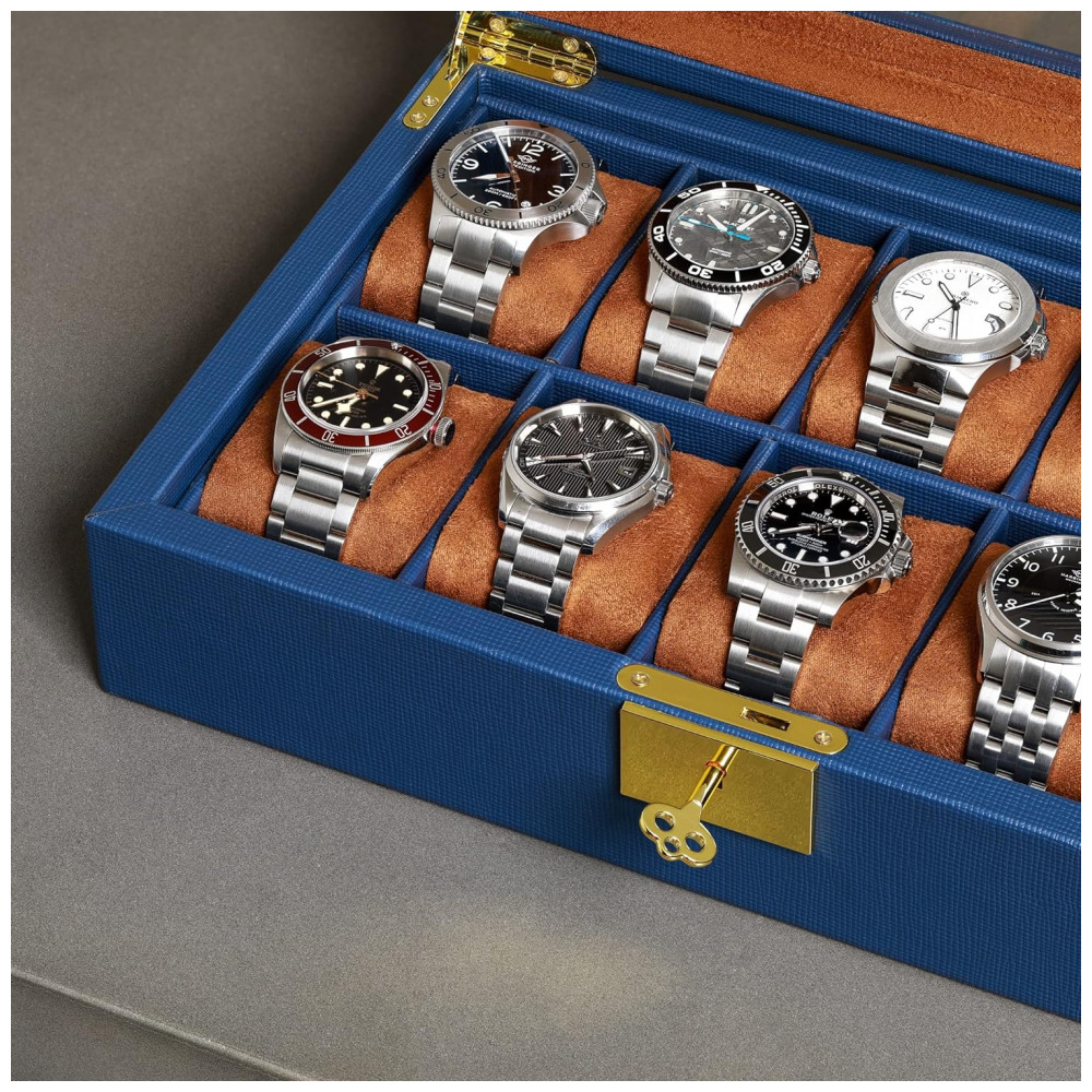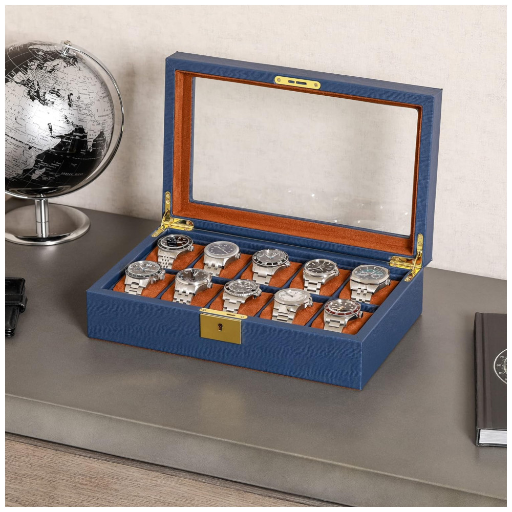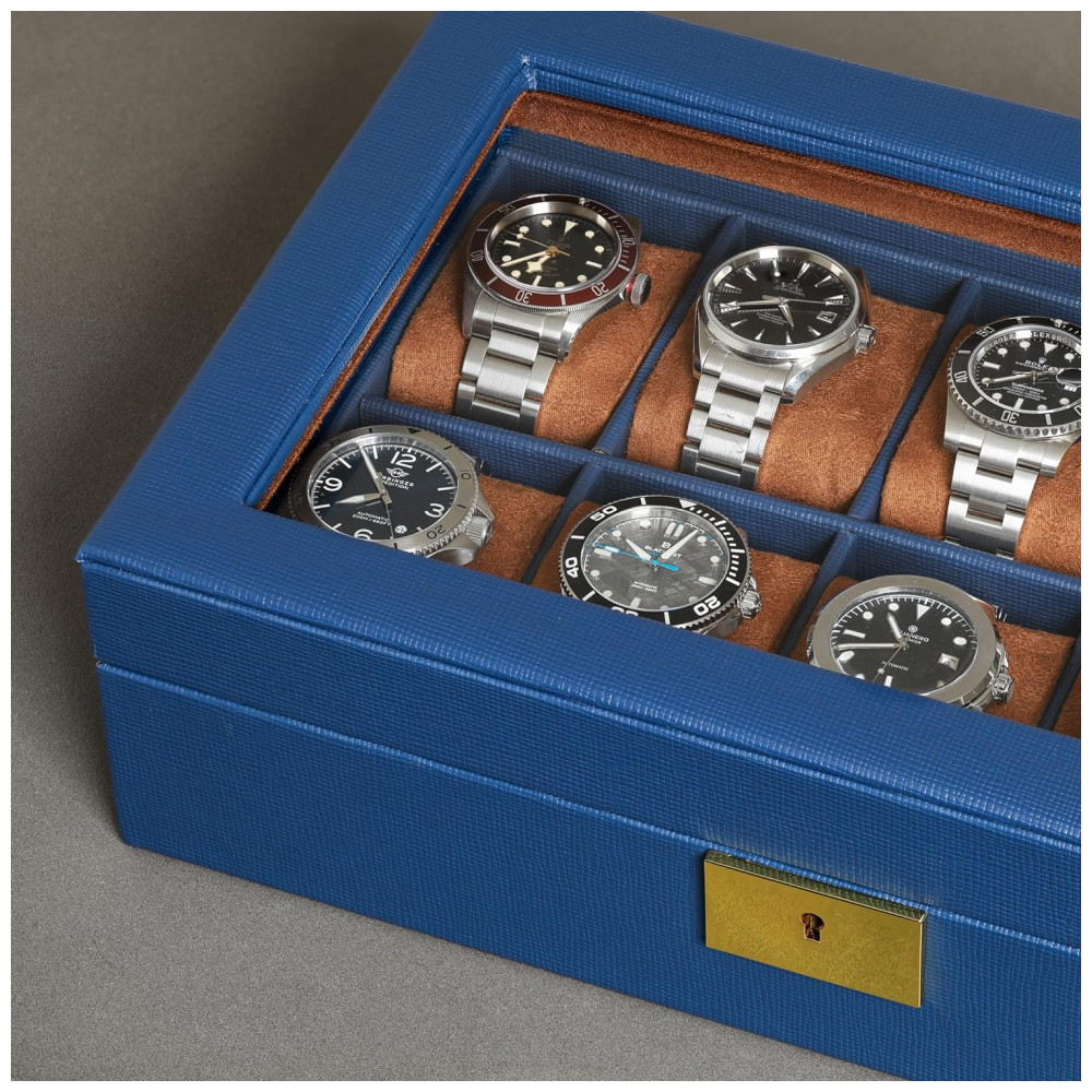 Caixa Estojo de Couro com Trava e Visor de Vidro para Relógios com 10 Compartimentos ROTHWELL Azul e Marrom