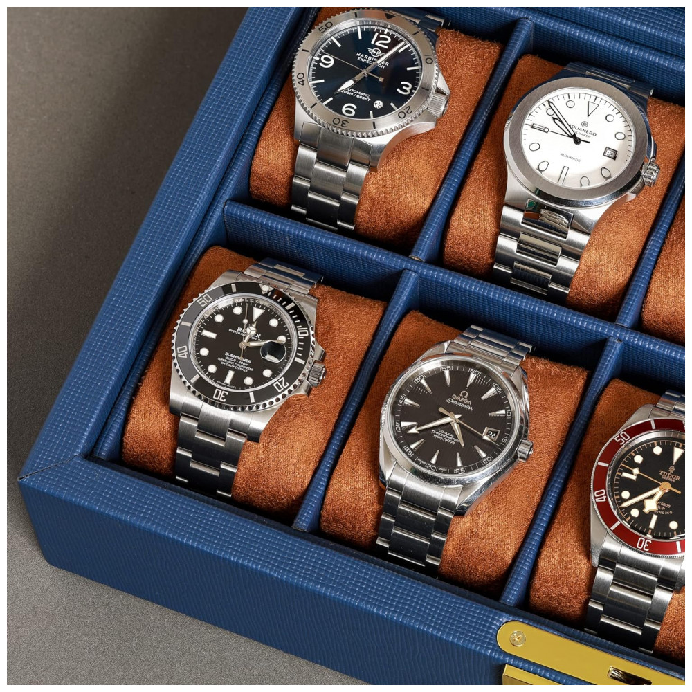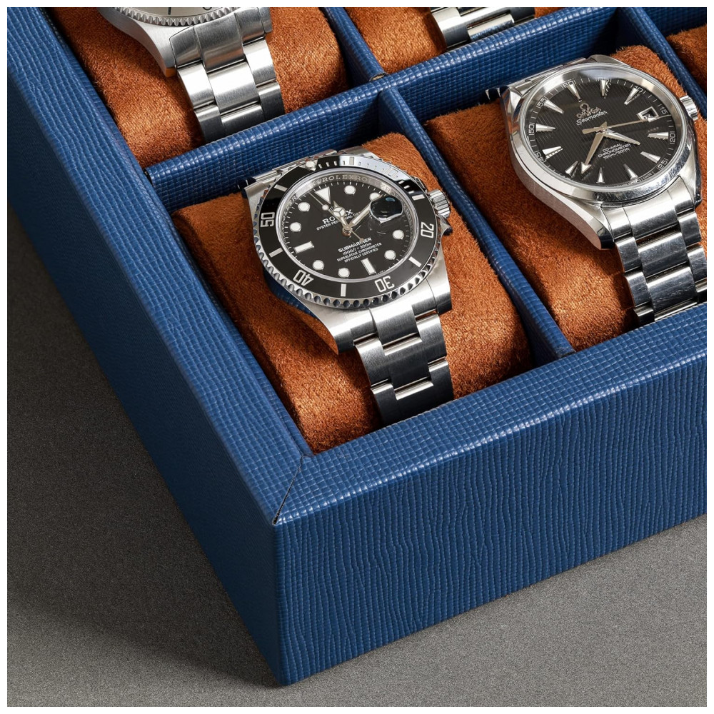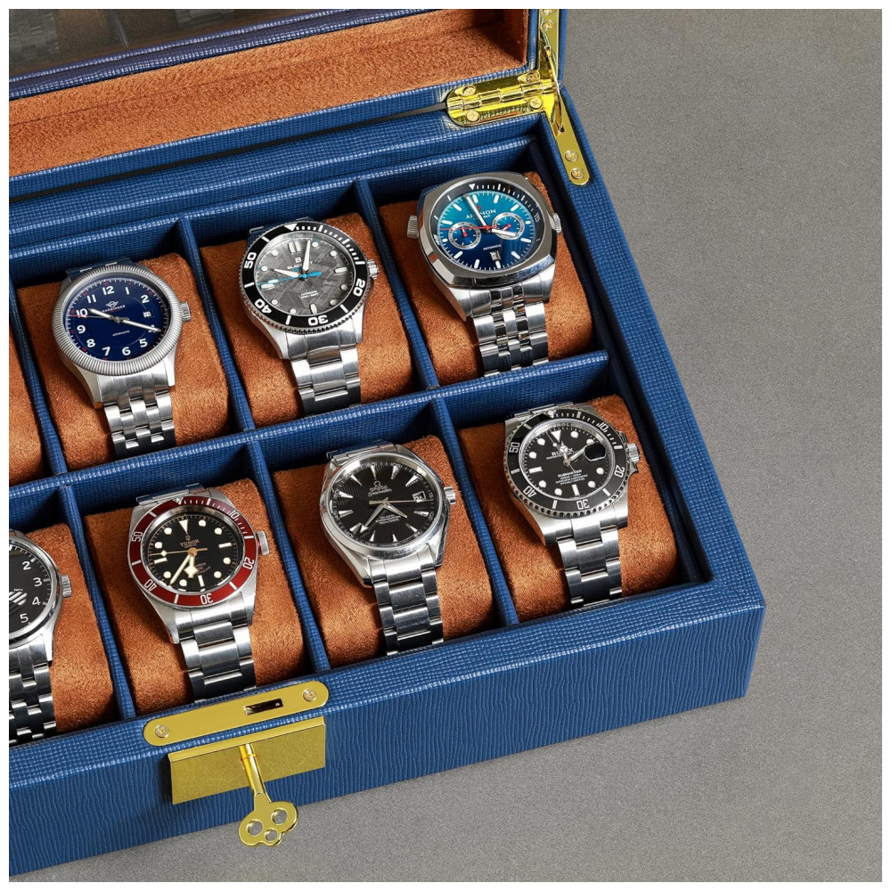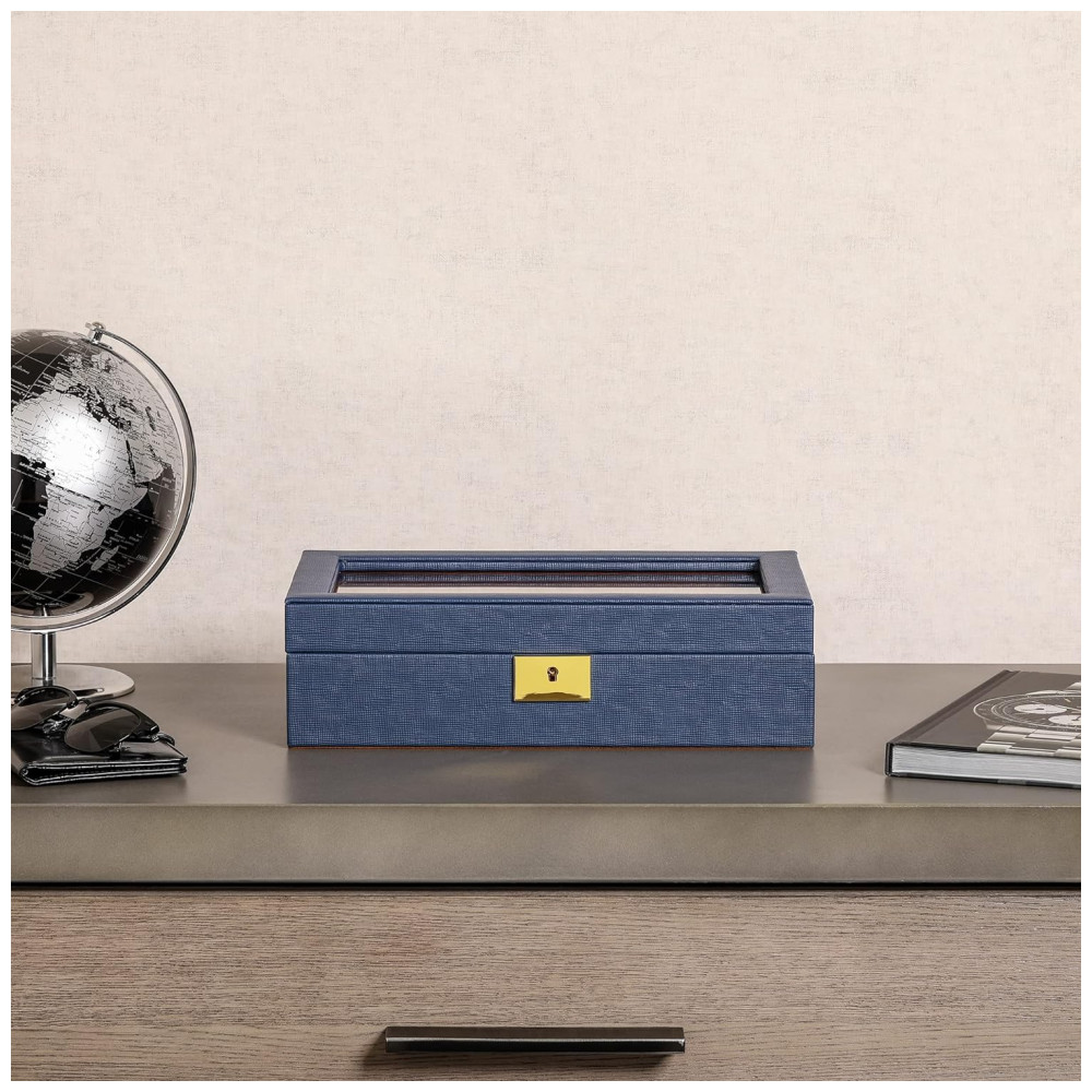 Caixa Estojo de Couro com Trava e Visor de Vidro para Relógios com 10 Compartimentos ROTHWELL Azul e Marrom