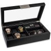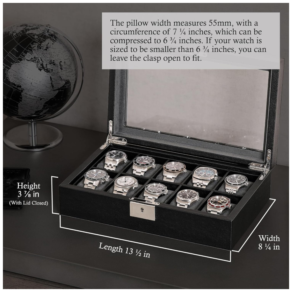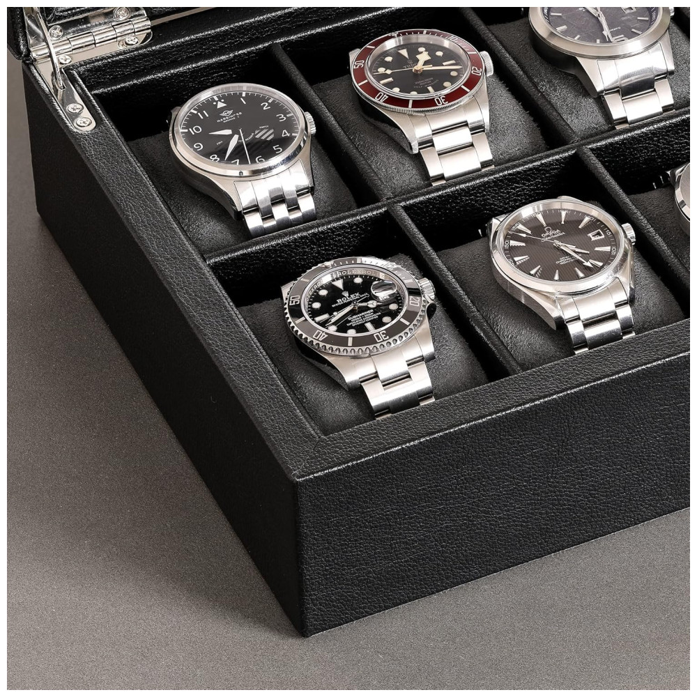 CAIXA DE EXIBIÇÃO DE RELÓGIO PARA HOMENS E MULHERES Cada almofada em nosso organizador de relógios contém um relógio pequeno ou grande até perfeitamente no lugar um ao lado do outro. Além disso, há muito espaço entre a tampa e as almofadas do nosso porta relógios para acomodar relógios de todos os tamanhos.