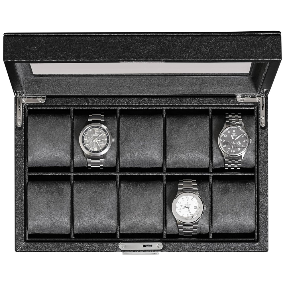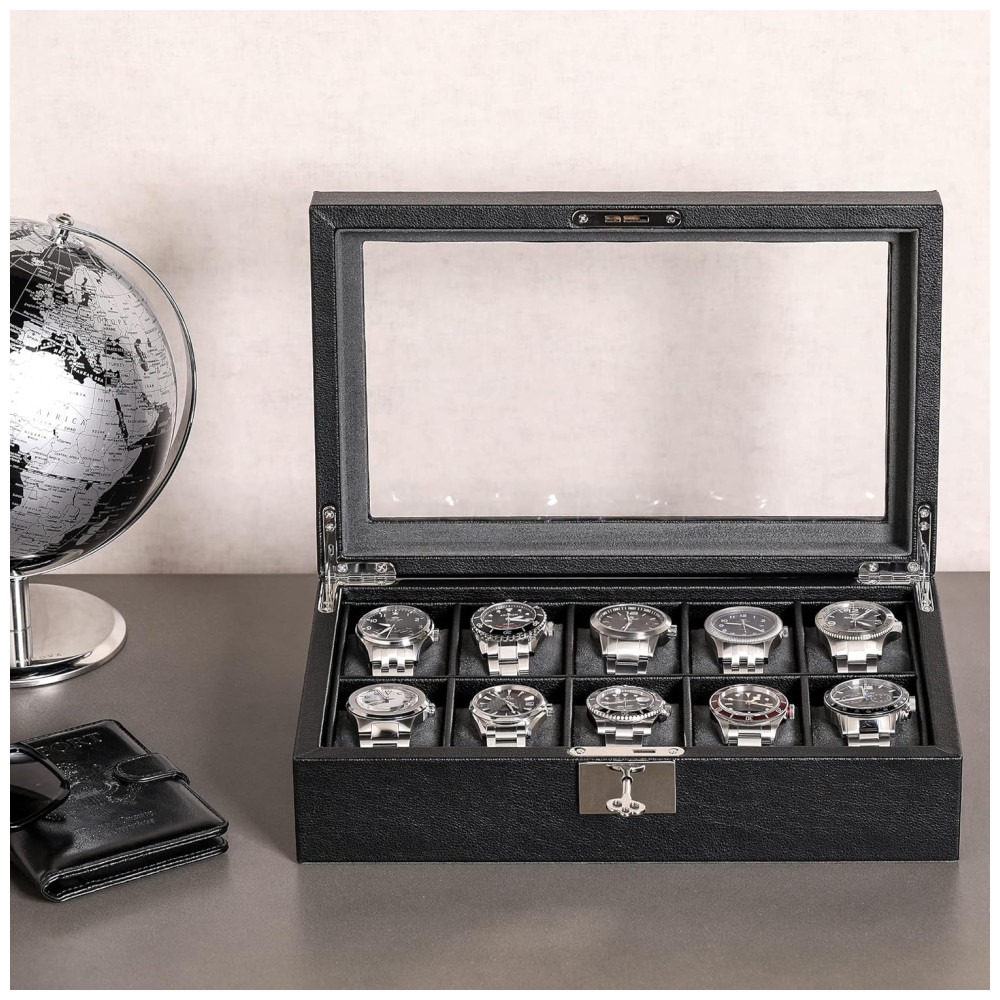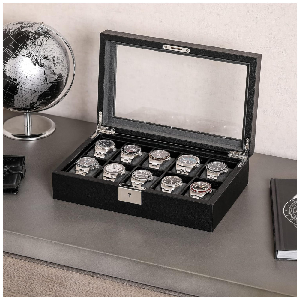 DEZ SLOTS Com dez 10 slots, nossa caixa de vidro oferece muito espaço para zenar toda a sua coleção de relógios. Nosso organizador de porta relógios parece simplesmente fantástico enquanto atua como um lindo e deslumbrante estojo de zenamento.