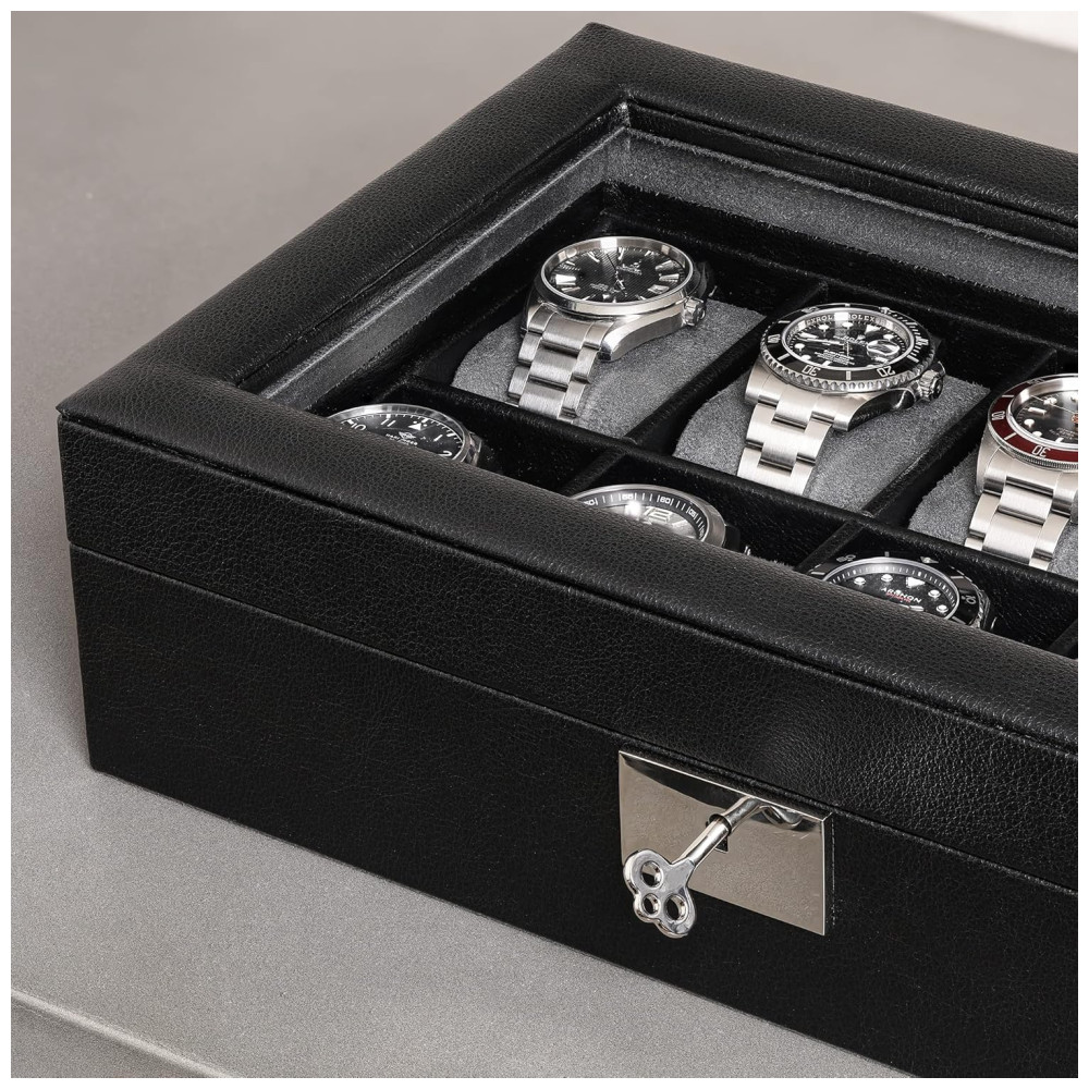 Caixa Estojo de Couro com Trava e Visor de Vidro para Relógios com 10 Compartimentos ROTHWELL Preto e Cinza