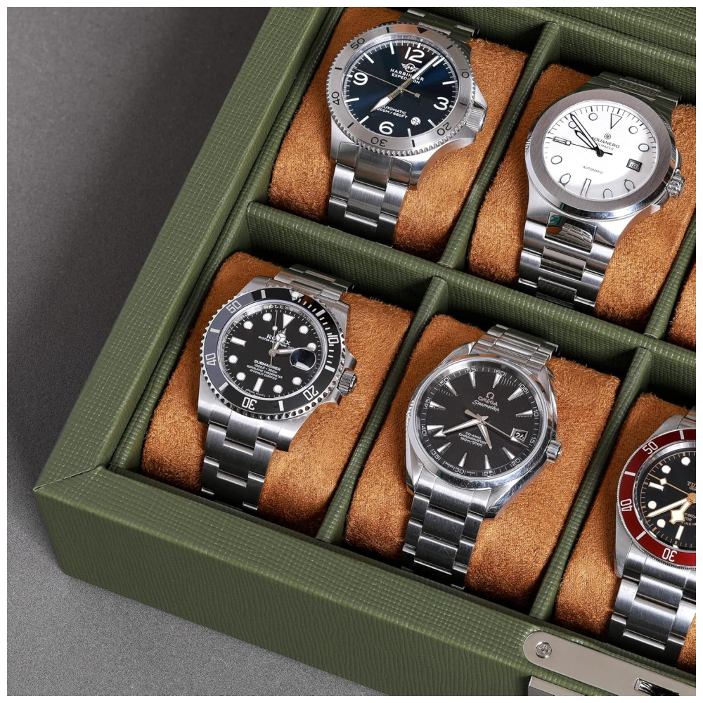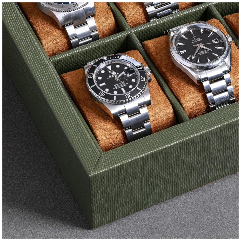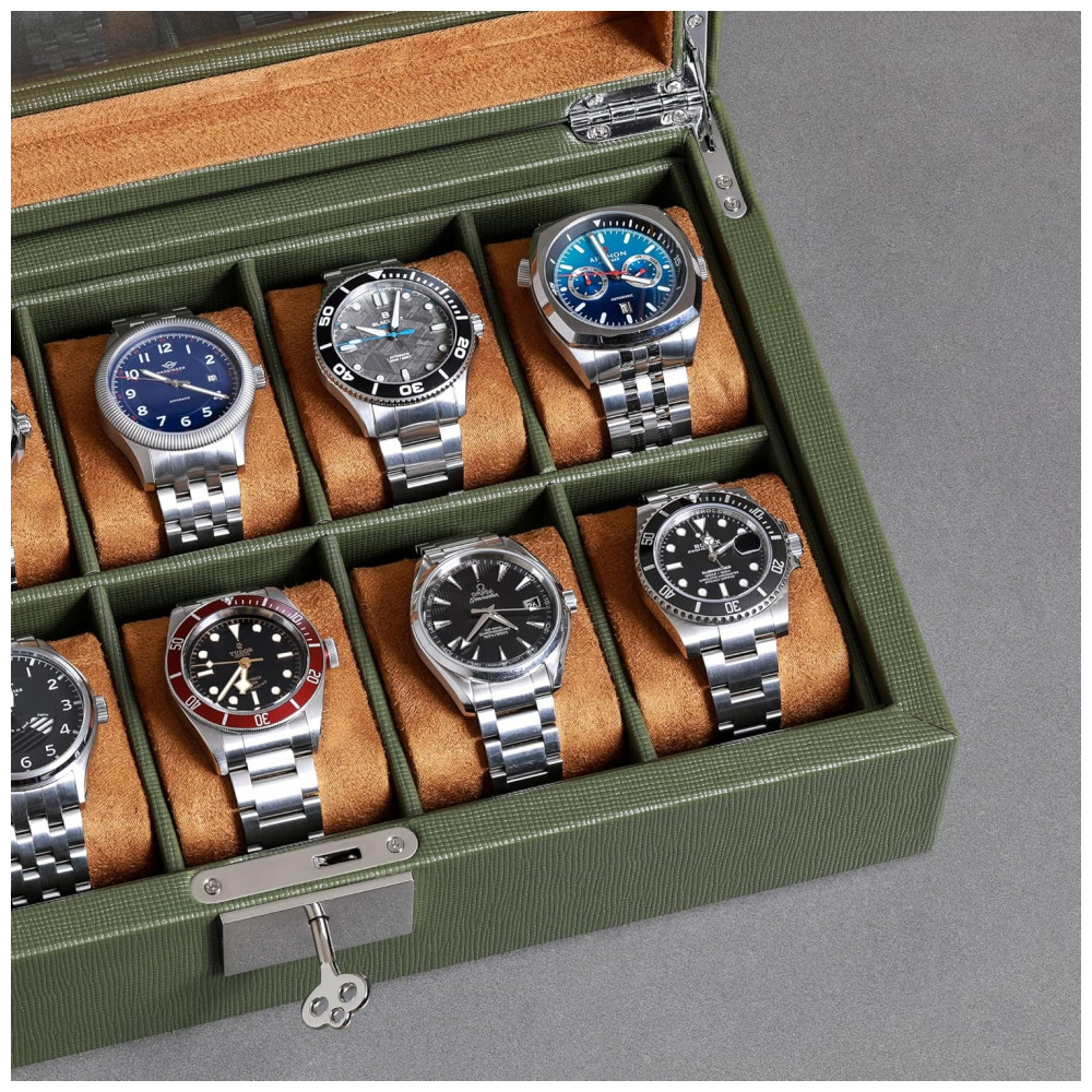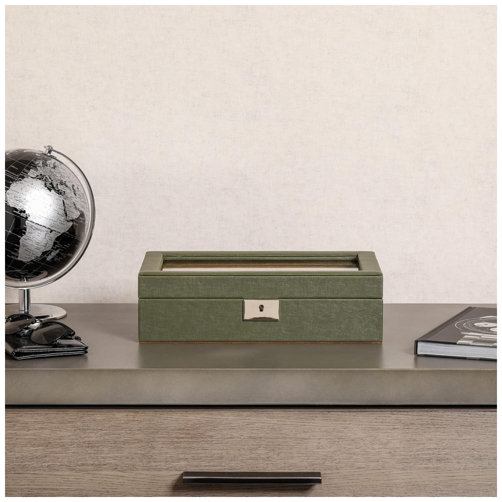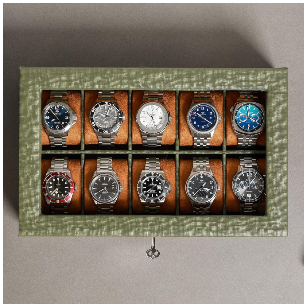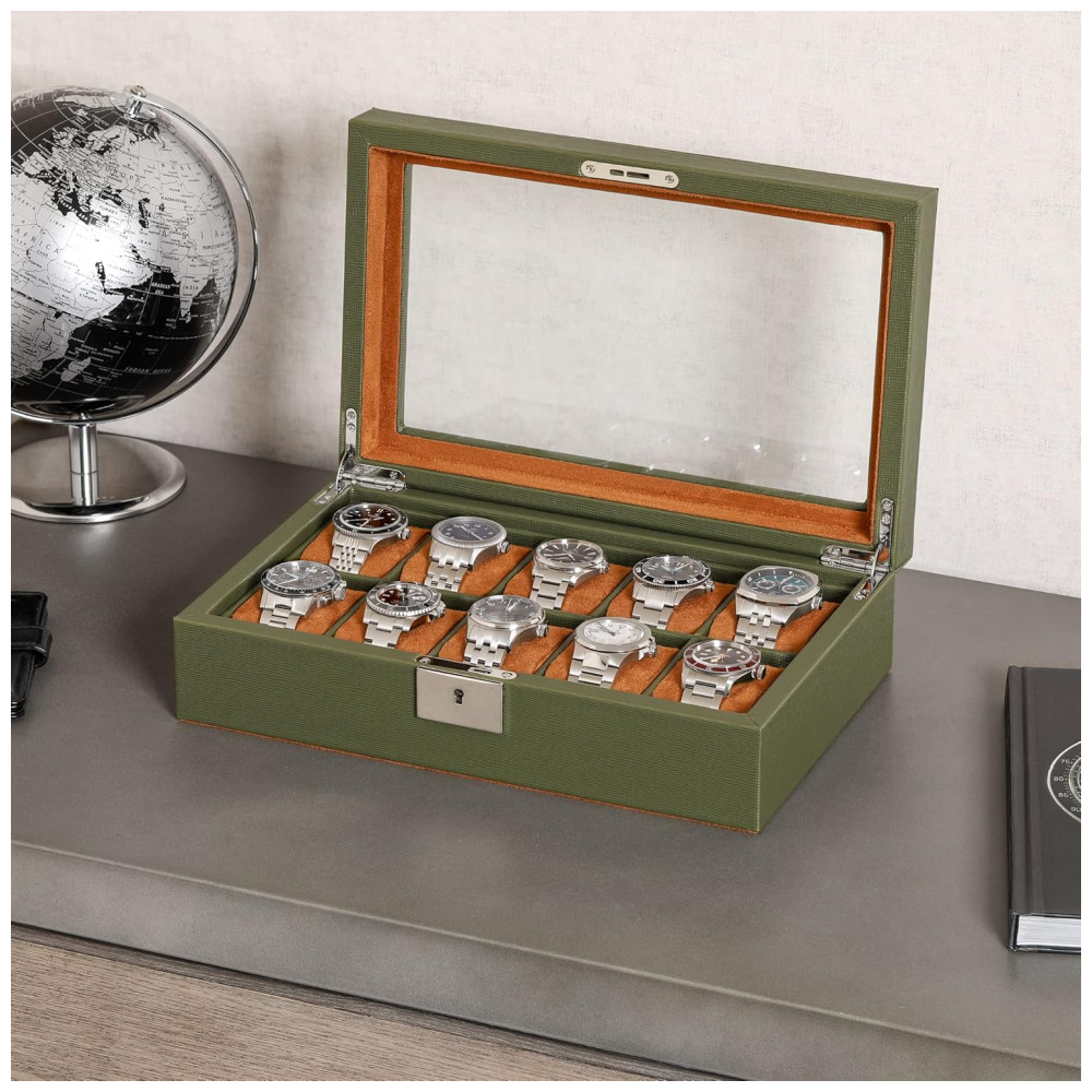 Caixa Estojo de Couro com Trava e Visor de Vidro para Relógios com 10 Compartimentos ROTHWELL Verde e Marrom