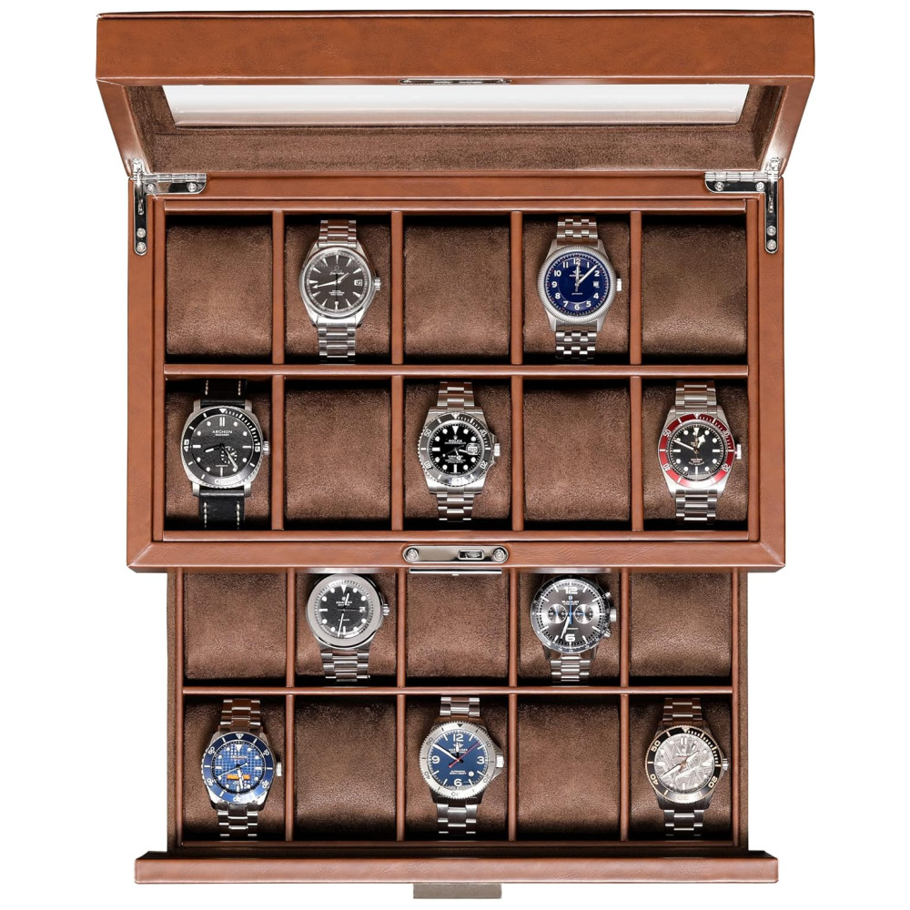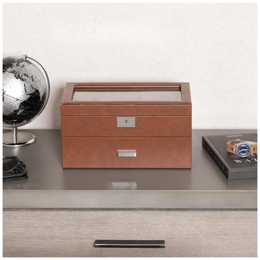 Caixa Estojo de Couro e Tampo de Vidro para Relógios com 20 Compartimentos ROTHWELL Marrom
